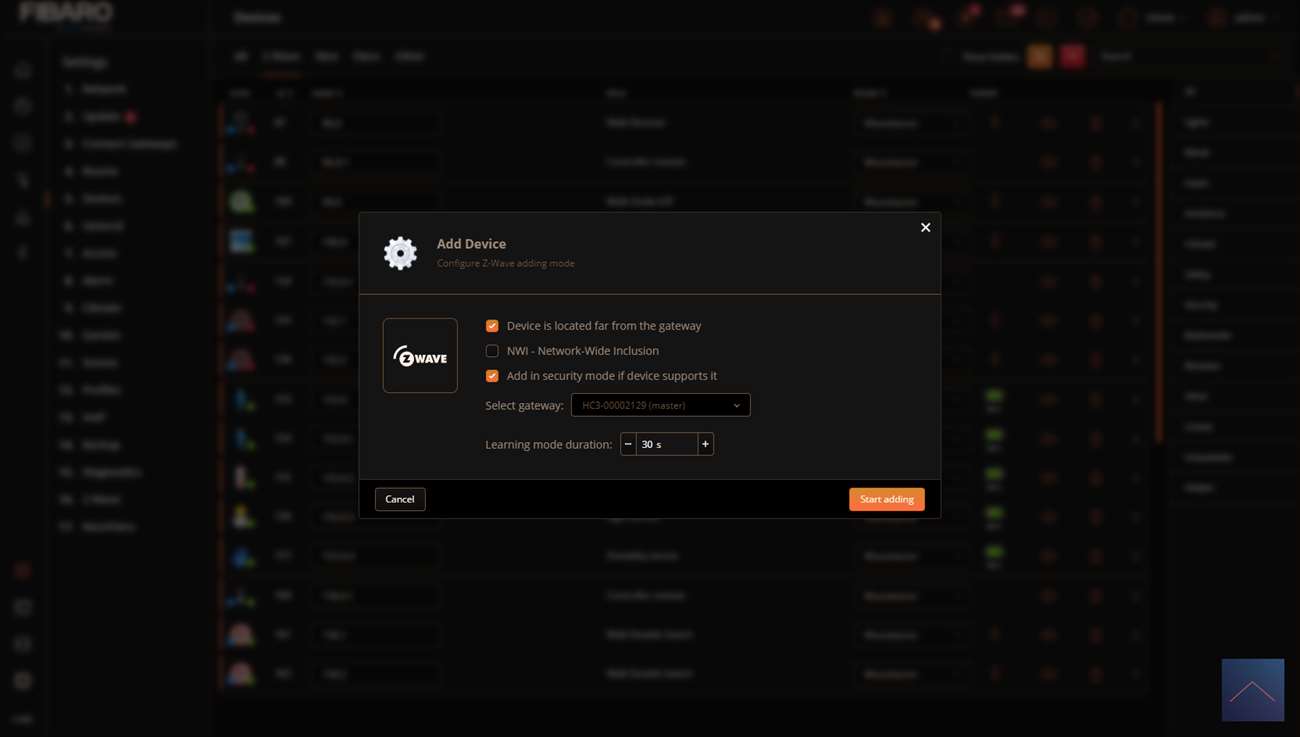 We voorzien hem eerst van stroom door hem in het stopcontact te duwen. Hierna loggen we in op de HC3. We gaan naar onze apparaten en drukken op het plusje. Nu moeten het toevoegen starten door het knopje aan de zijkant 5 seconden ingedrukt houden tot de LED blauw wordt om hem vervolgens los te laten. Wacht niet tot de LED uit is want dan zal het toevoegen niet lukken. De HC3 geeft een melding dat hij aan het "toevoegen" is en ik zie de LED van de sensor blauw knipperen.