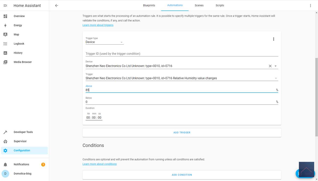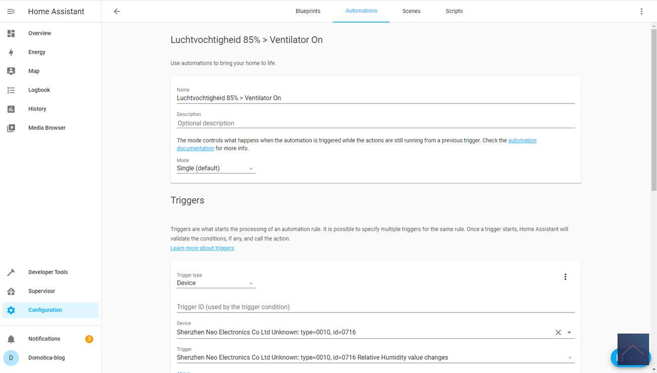 Met de repeater functie valt natuurlijk geen scene te maken. Dus maken we een voorbeeld met de luchtvochtigheidsensor. Als deze boven de 85% komt dan zetten we de ventilator aan. Op deze manier kunnen wij zorgen dat het niet te vocht wordt in de badkamer.