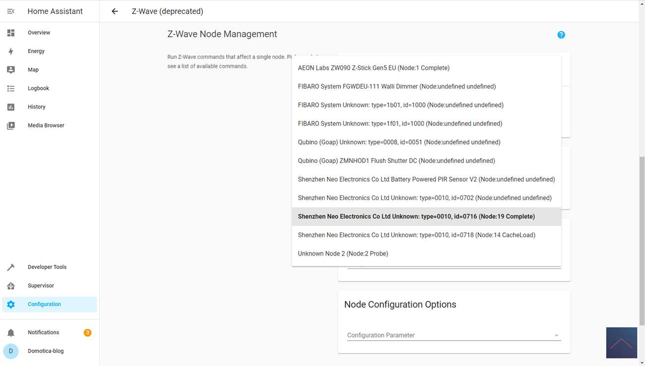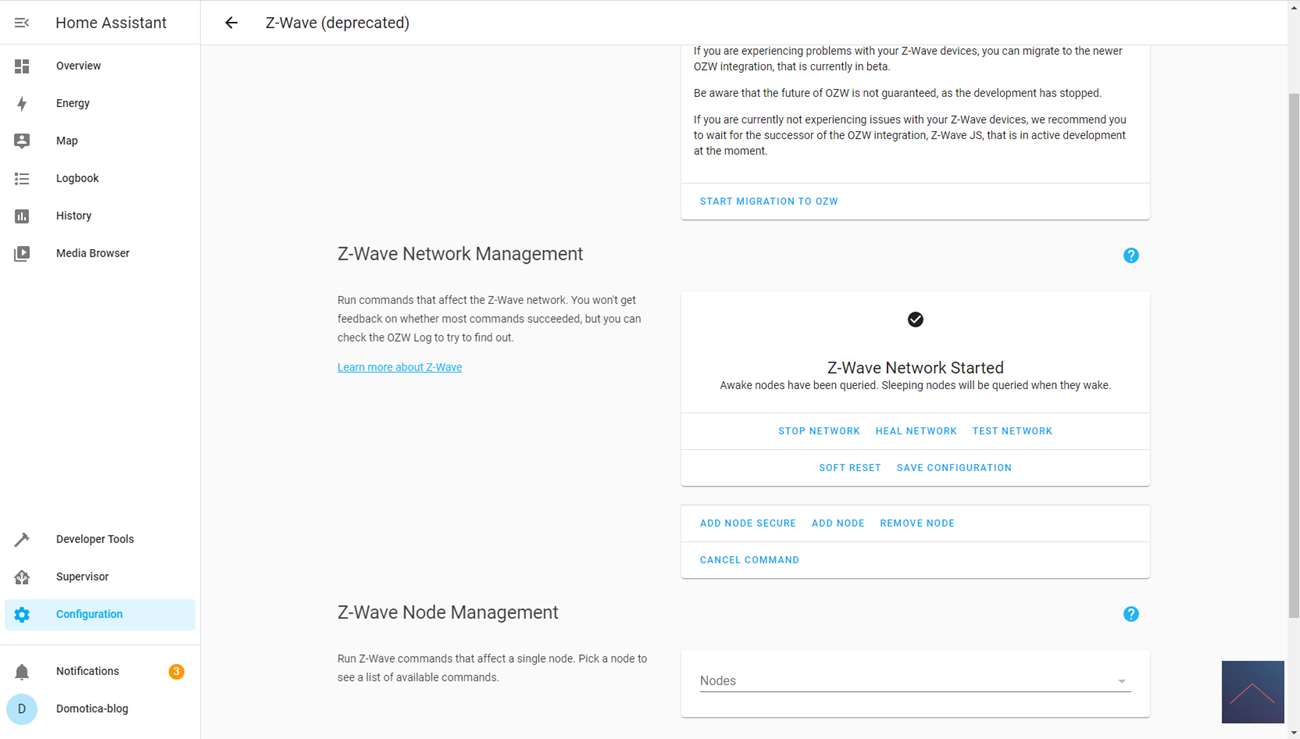 Om hem te installeren starten we HASS op en gaan we naar je configuratie en hierna naar Z-Wave. Vervolgens klik je op "add node secure" om het toevoegen te starten. HASS geeft een zeer korte melding dat het toevoegen is gestart.