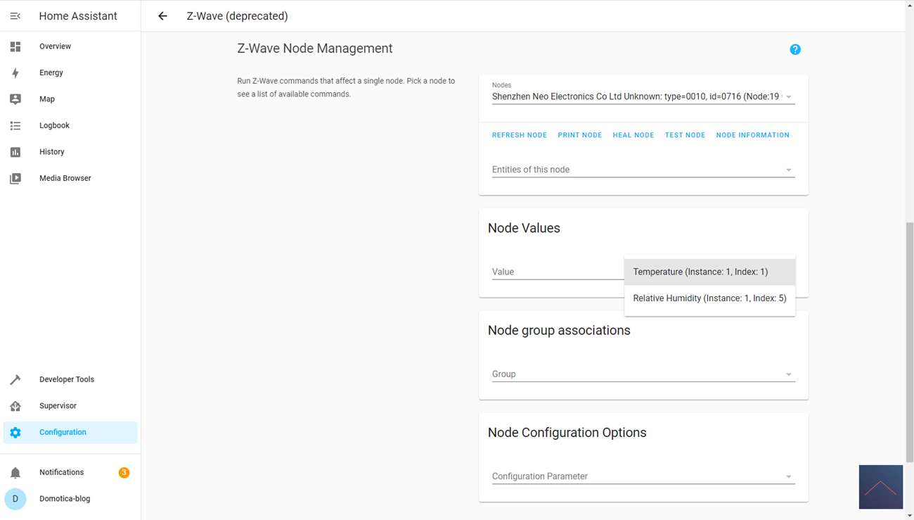 Bij de nodes zie ik een hele rij waaronder de temperatuur-, luchtvochtigheidsensor en de repeater. Helemaal compleet dus. Of de repeater werkt kan ik helaas niet zien. Het valt ook op de temperatuurmeter een - 4,4 graden aangeeft. Dit lijkt dus niet helemaal te kloppen. Gelukkig kun je dit via de parameters corrigeren.