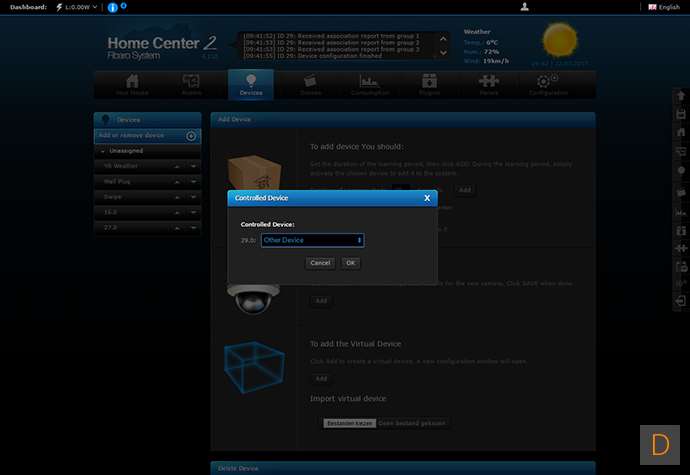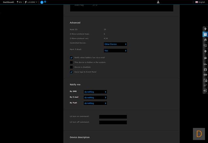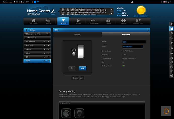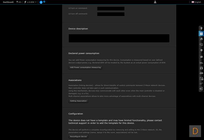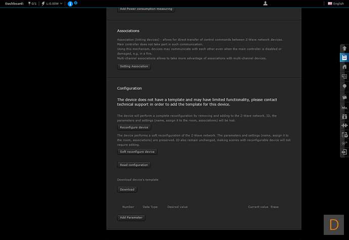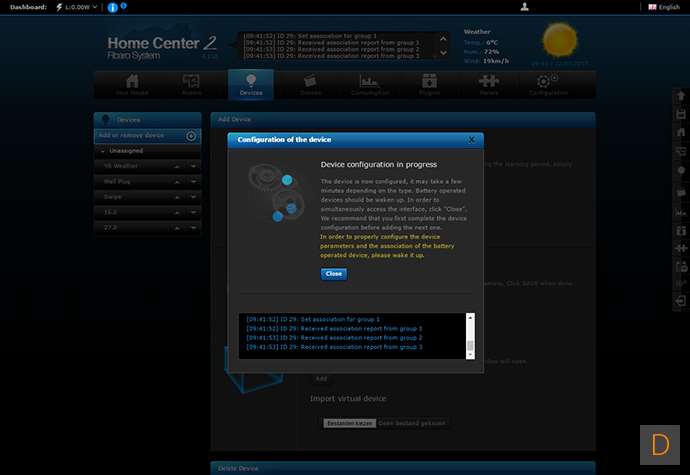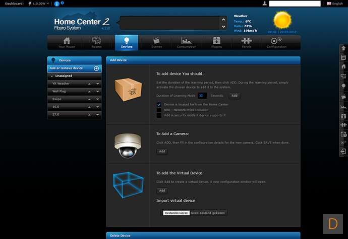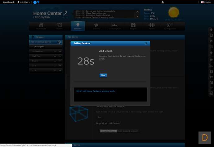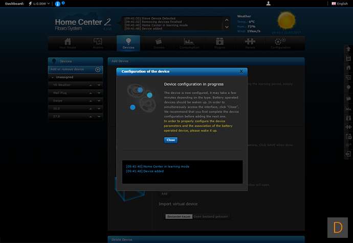 Het toevoegen van deze sirene gaat door in te loggen op de HC2 en naar het apparaten gedeelte te gaan. Vervolgens klik je op "add devices" om de toevoegen procedure te starten. Hierna moet je het lipje bij de batterij verwijderen, of indien je dit al gedaan had, 3x op het toevoegen knopje te klikken. De sirene werd netjes gevonden door de HC2, alleen ontbreekt een template. Hierdoor wordt hij gevonden als een aan/uit schakelaar en moet je zelf de parameter opzoeken in de handleiding om de configuratie te veranderen.