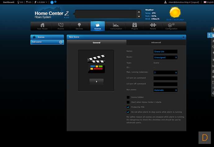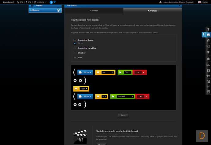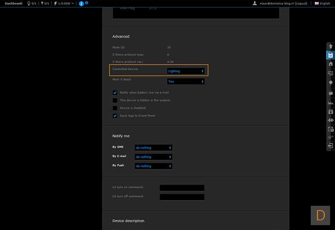 Na het toevoegen van de sirene wil je hem natuurlijk gebruiken in je alarm paneel. Het is belangrijk dat de "controlled devices" op "lighting" staan anders kun je hem zo direct niet selecteren.