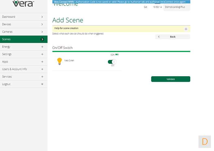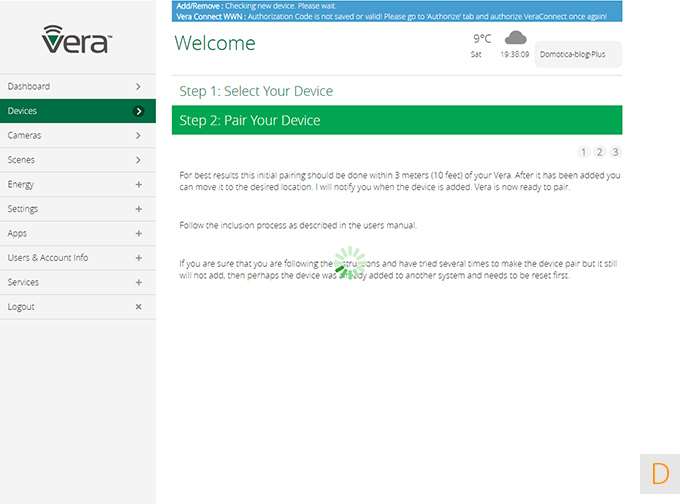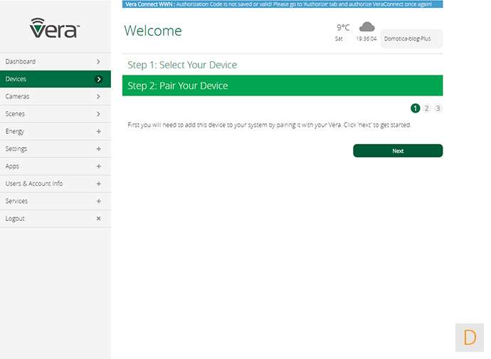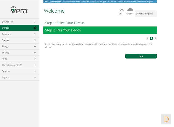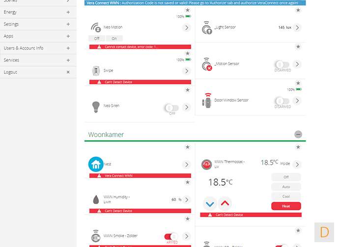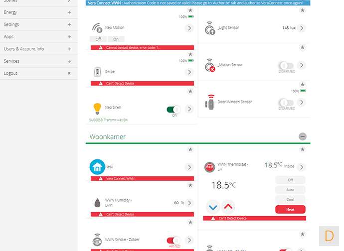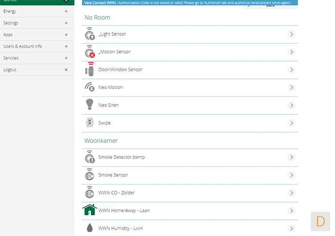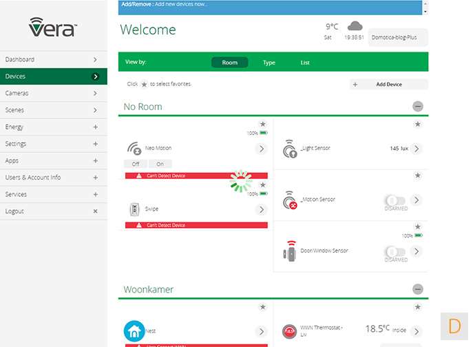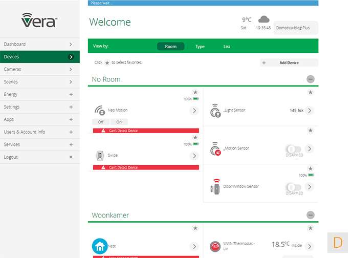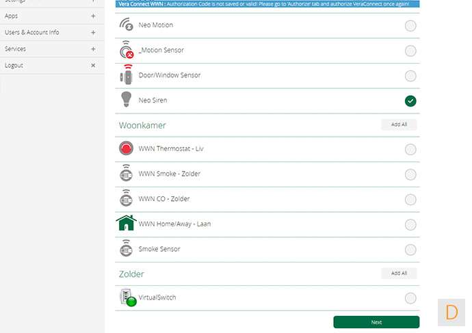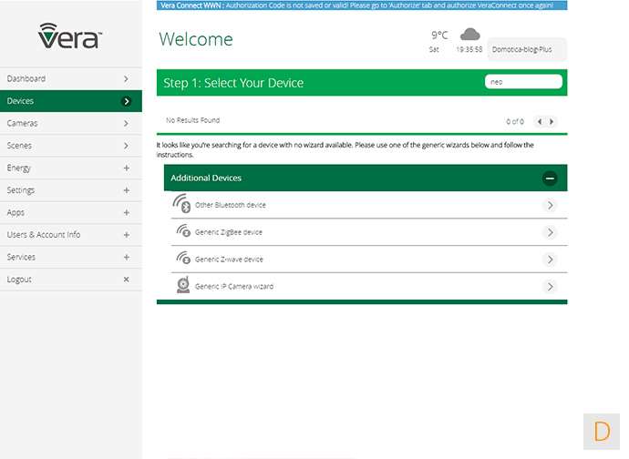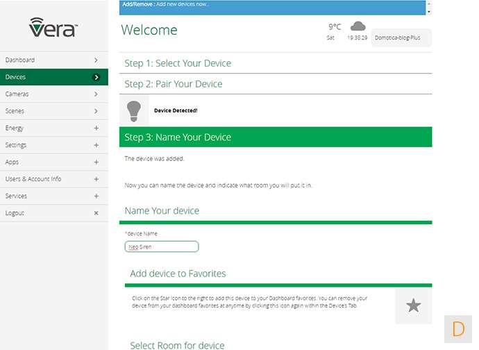 Deze sirene aan de Vera toevoegen gaat door naar het apparaten gedeelte te gaan en op "add device" te klikken. Vervolgens zoek je op Neo. Helaas werd hij niet gevonden en moest ik het proberen met een de "generic device". Na verwijderen van het lipje bij de batterij (of 3x klikken op de toevoegen knop) werd hij gevonden.