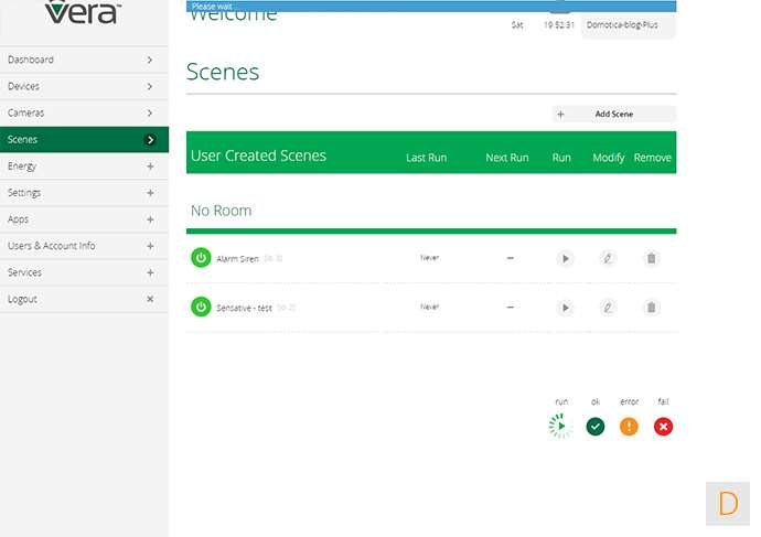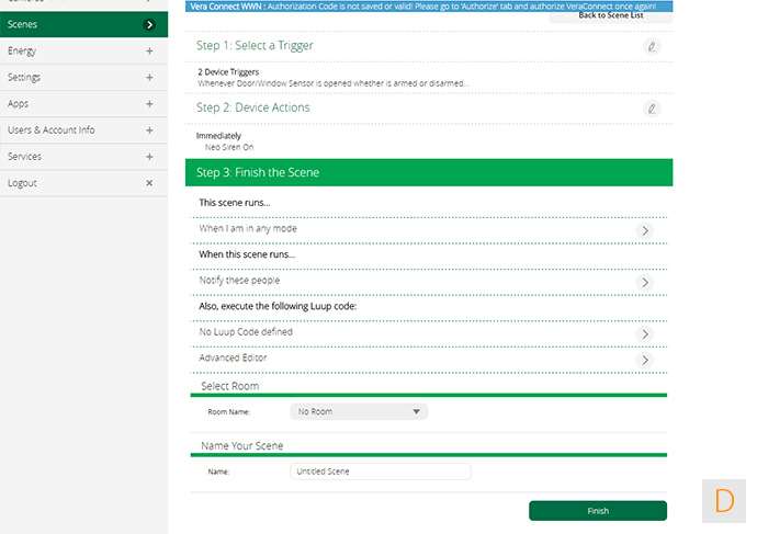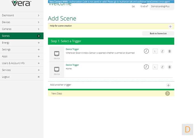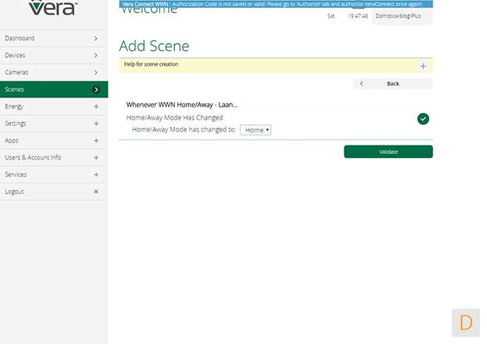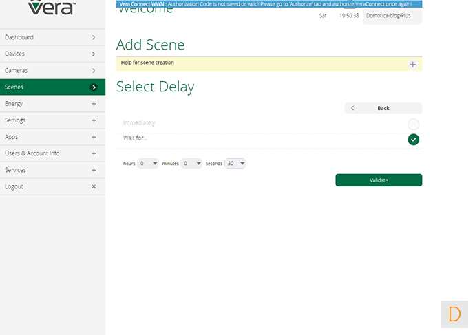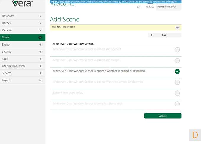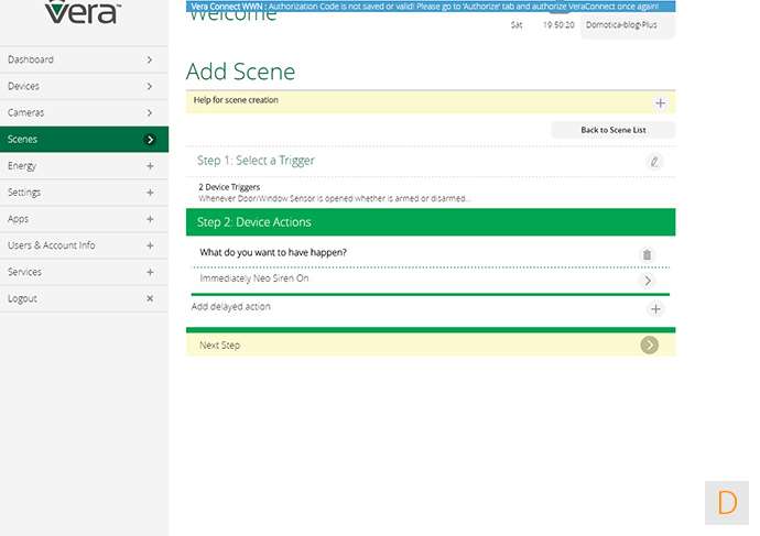 Ik zal een scene maken welke bij het openen van de deur een alarm geeft via de sirene, uiteraard alleen als ik niet thuis ben. Hiervoor gebruik ik de GEO locatie van de Vera APP. Ik gebruik ook nog een vertraging van 30sec. zodat ik het alarm nog kan uitzetten.