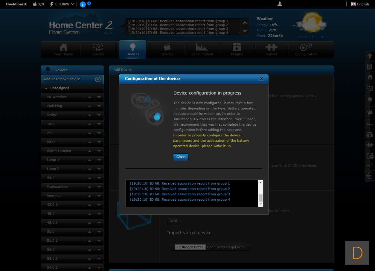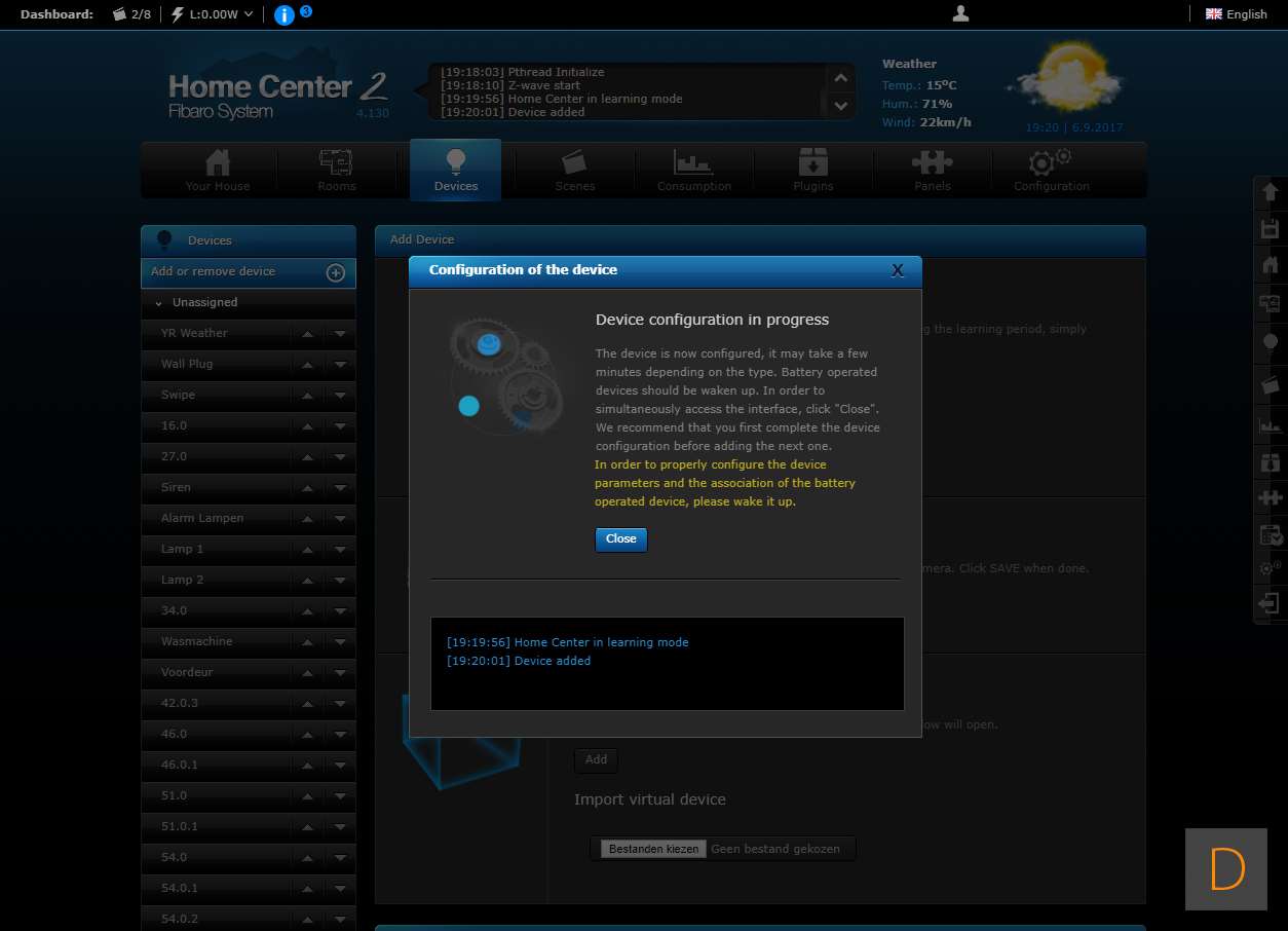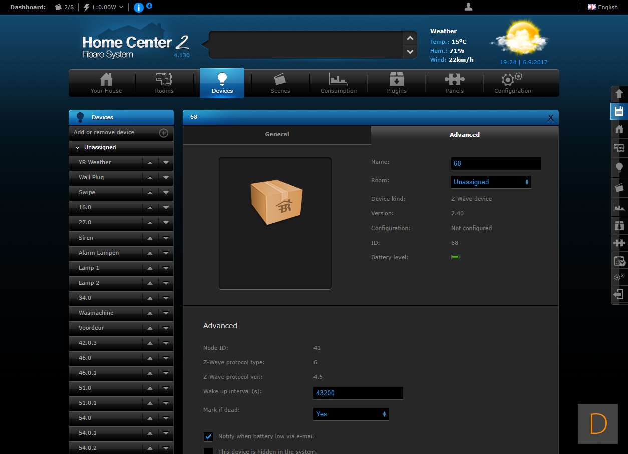 Het installeren van deze water sensor gaat door in te loggen op je HC2 en naar het apparaten gedeelte te gaan. Vervolgens klik je op "add or remove device" waarna je op "add" moet klikken om het toevoegen te starten. Hierna is het een kwestie van de sensor open te draaien en 3x op het toevoegen knopje te klikken. De sensor werd netjes gevonden en toegevoegd. Op het dashboard zie hoofd node, een node om hem scherp te zetten en of er water is gedetecteerd. Er is geen template beschikbaar maar alles lijkt prima te werken.
