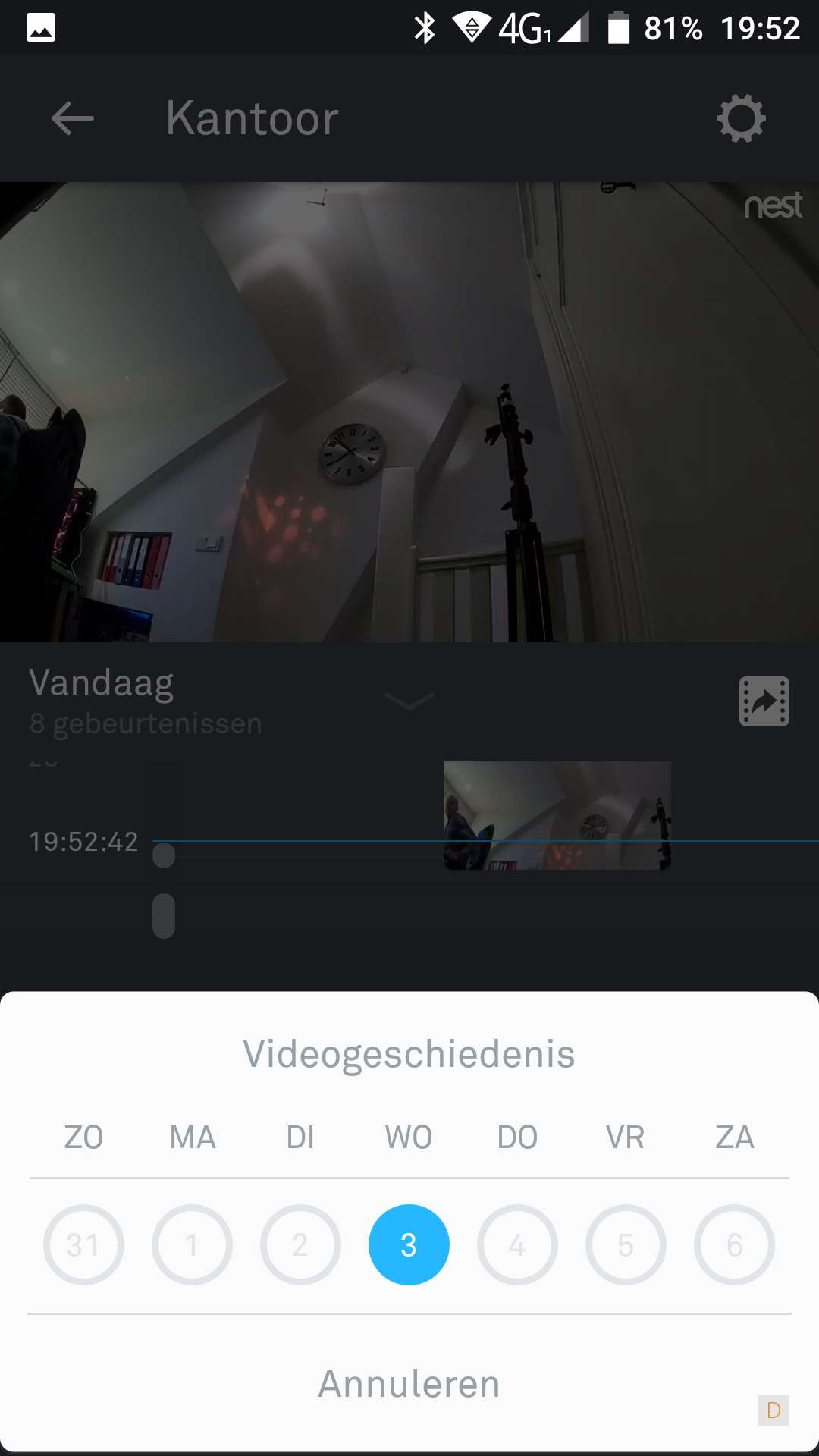 De camera neemt continue op. Je kunt dus via een tijdlijn elk moment van de dag bekijken. Als er een beweging wordt gedetecteerd zal deze als clip op de tijd lijn worden weergegeven. Ik vind dit niet helemaal gebruiksvriendelijk werken omdat je vrij lang moet scrollen om de juiste video te vinden.