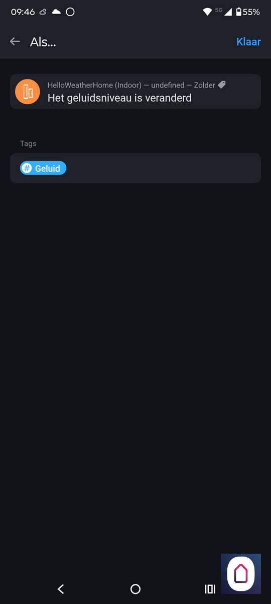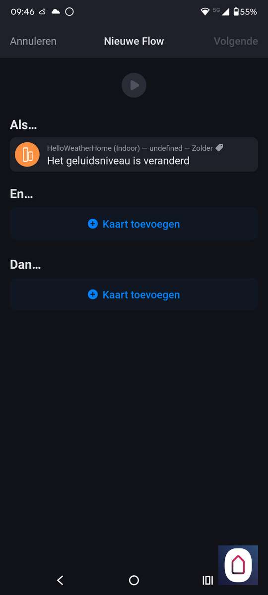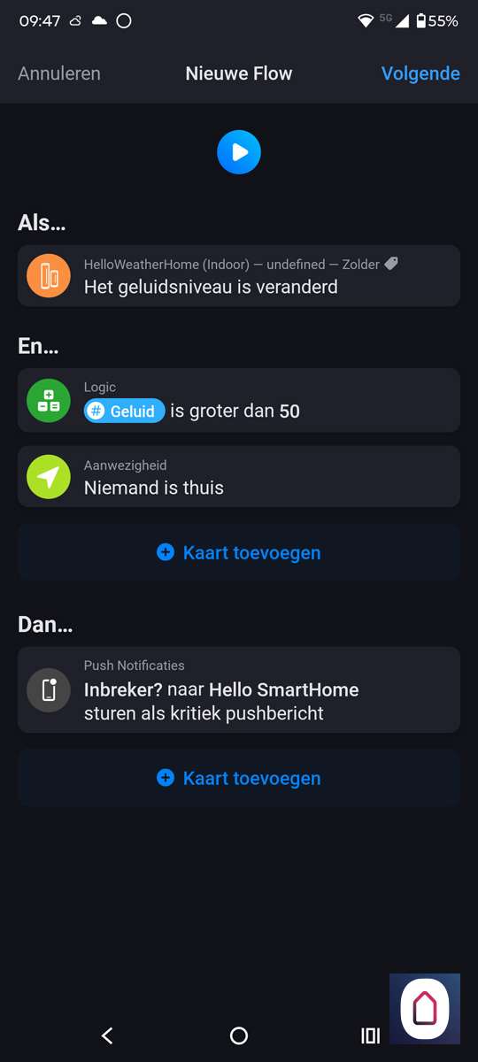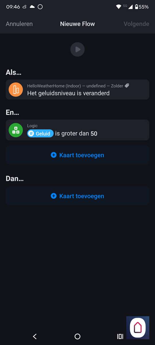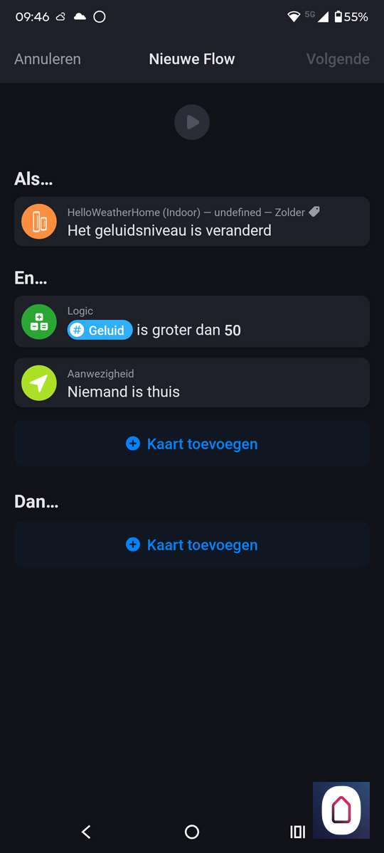 De binnen unit heeft een geluidsniveau meter. Het is misschien wel grappig om hier een flow van te maken als een soort inbraakalarm. We nemen als uitgangspunt de geluidsmeter als deze boven de 60db komt en er is niemand thuis sturen we een notificatie.