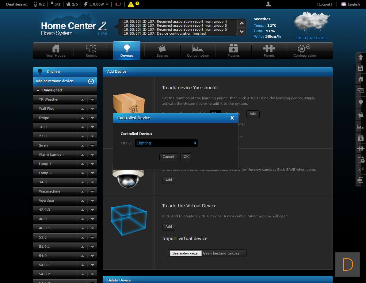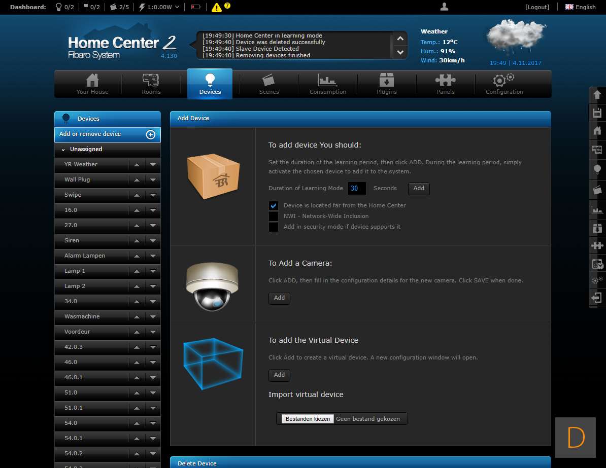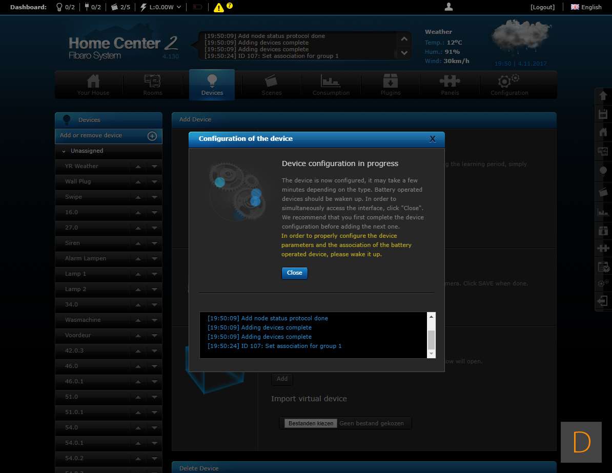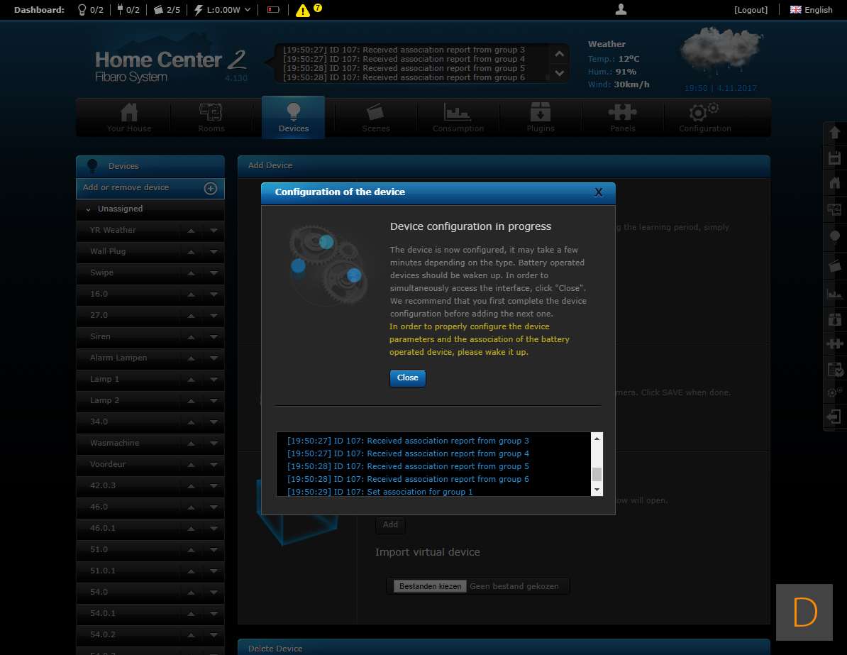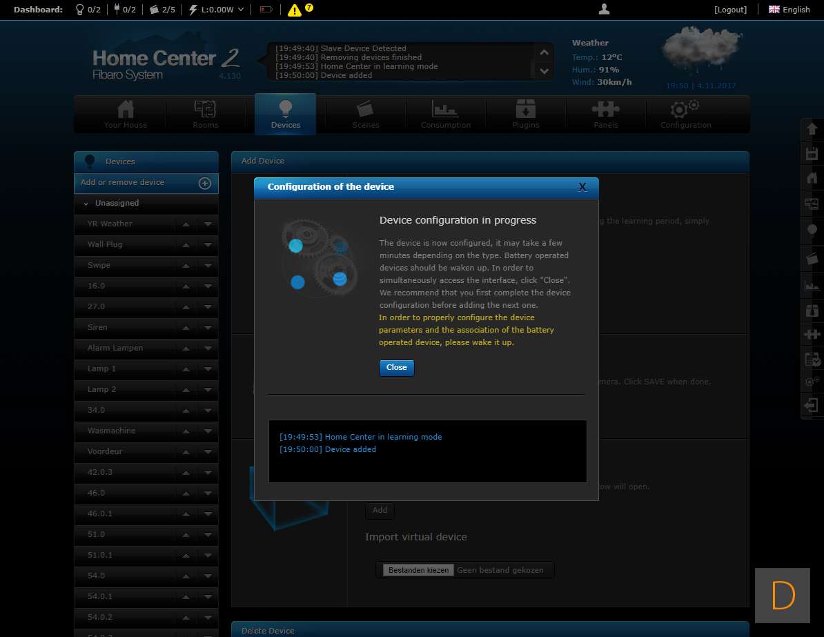 Om het toevoegen van deze plug te starten log je in op je Home Center. Vervolgens ga je naar het device gedeelte en klik je op "add or remove device" en vervolgens op de "add" knop. Het aftellen zal beginnen. Hierna moet je de plug voorzien van stroom. Je kunt het toevoegen starten door 3 keer snel achter elkaar op het knopje aan de boven te drukken. Het knopje zal blauw oplichten om aan te geven dat het toevoegen is gestart. Zorg altijd dat je dicht bij de controller bent als je gaat toevoegen. Hij werd netjes gevonden en toegevoegd aan de HC2. Ik zie ook alle opties en configuratie mogelijkheden (aan en uit, totaal verbruik en huidig verbruik).