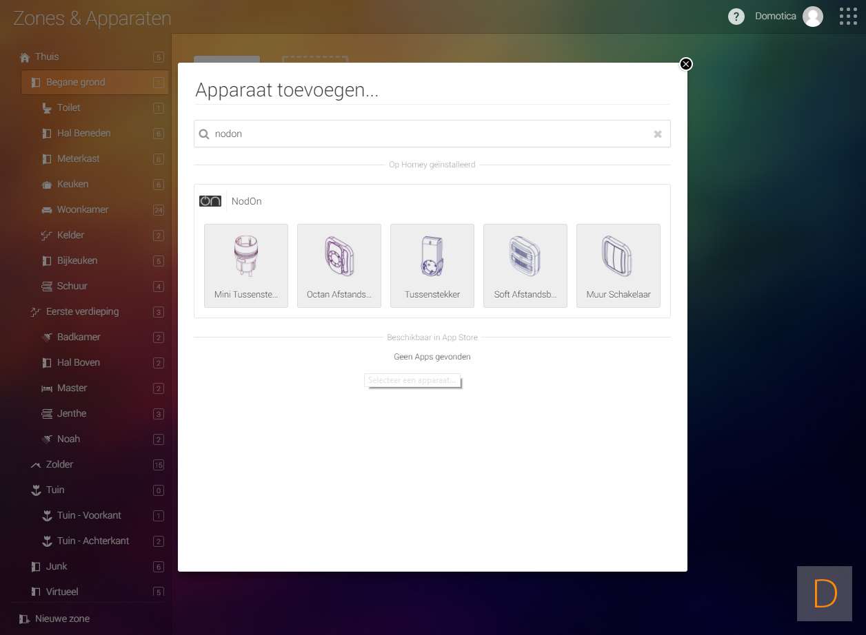 Als eerste gaan we deze plug toevoegen aan de Homey. Je kunt het toevoegen starten door in te loggen op de Homey en naar het apparaten gedeelte te gaan. Vervolgens klik je op het plusje en zoek je de NODon smart plug op. Om het toevoegen te starten druk je 3x op het knopje aan de bovenkant. Het LED zal blauw oplichten om aan te geven dat het toevoegen gestart is.