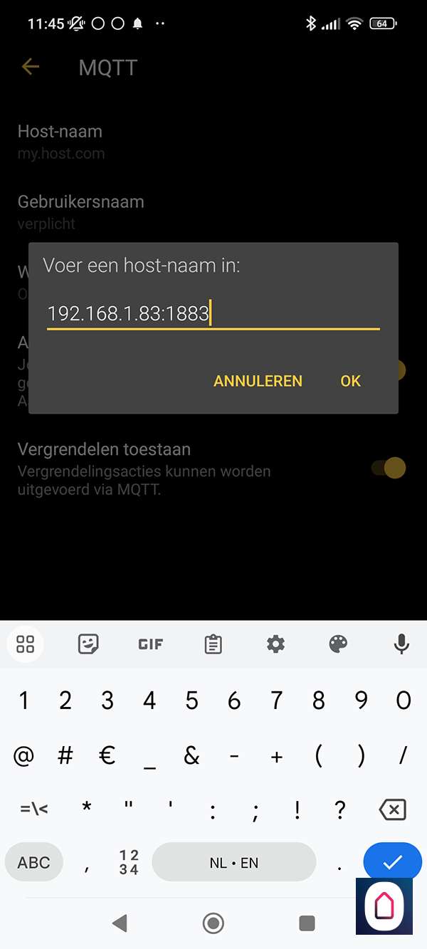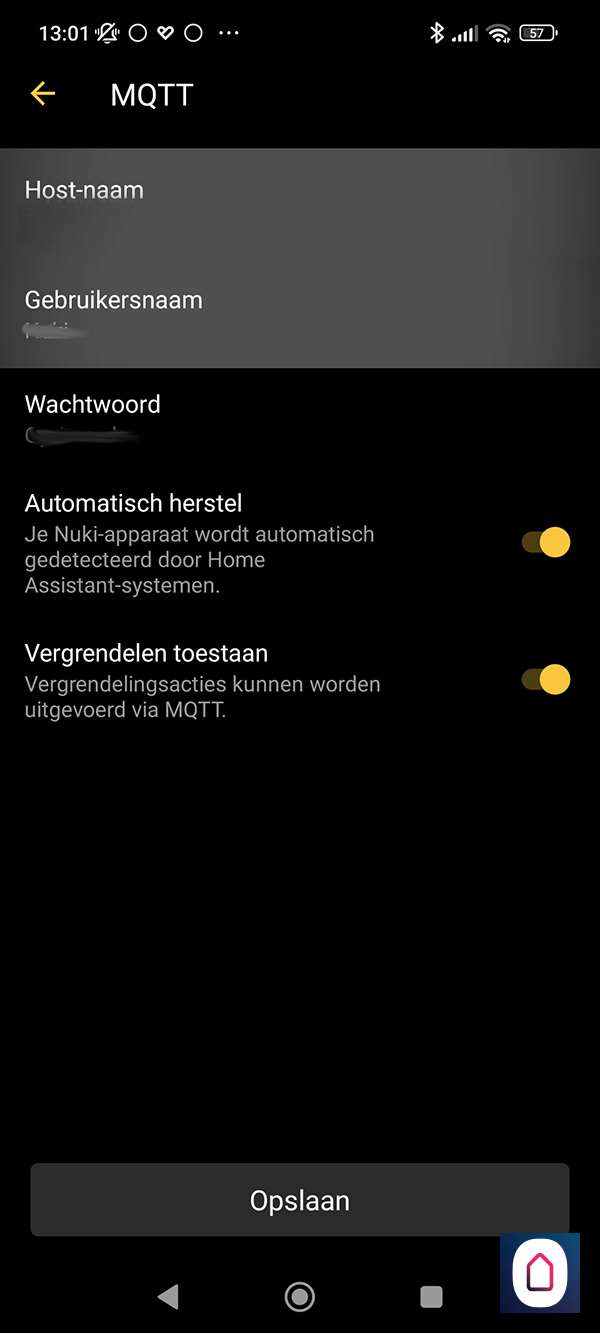 Nu gaan we naar de Nuki APP en naar functies en config van het slot en zoeken daar MQTT op en voeren het ip-adres van Home Assistant in, de gebruikersnaam en wachtwoord.