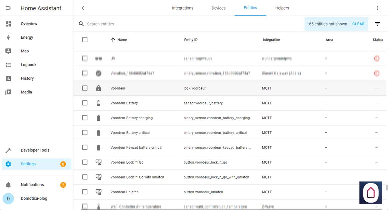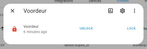 Als we nu naar Home Assistant terug gaan en naar onze apparaten, zien we daar het slot staan en kunnen we hem toevoegen aan onze dashboard.