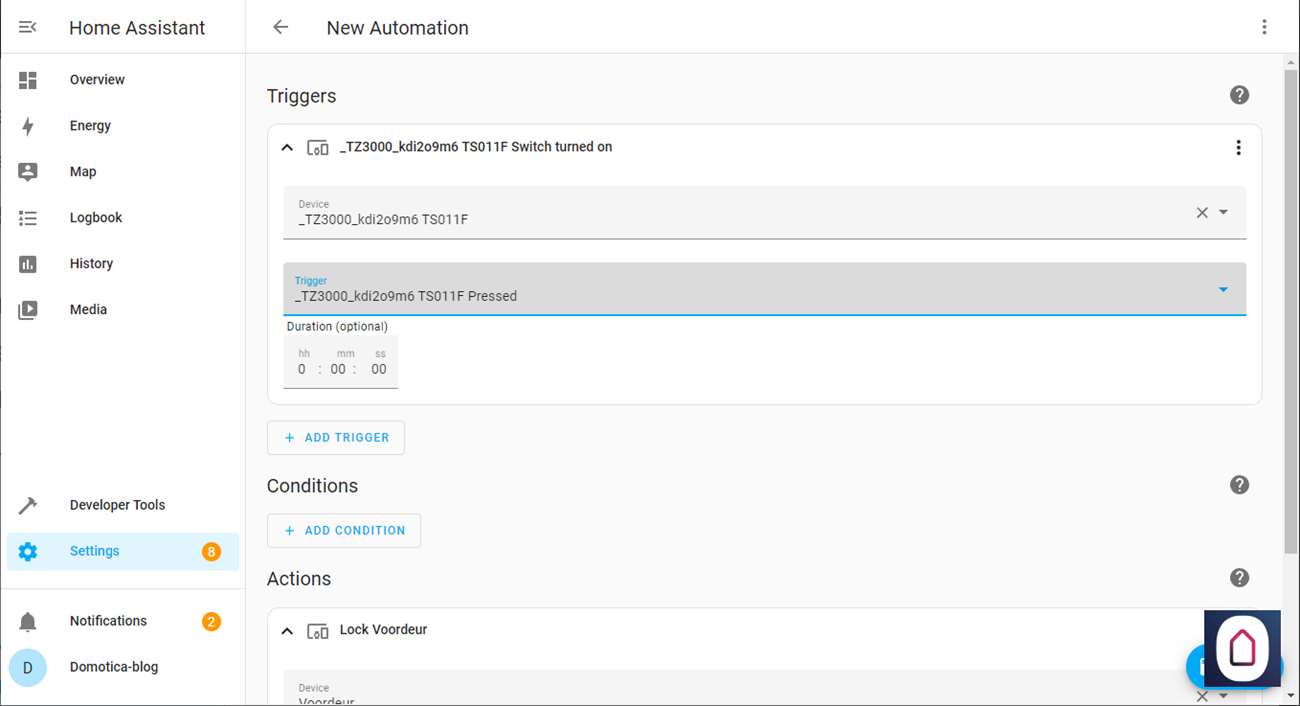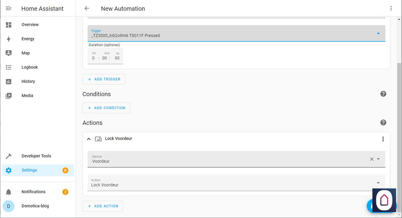 Gebruik een knop om deze slapen automation te starten deze gebruiken we als trigger, we zetten vervolgens de Nuki op slot.