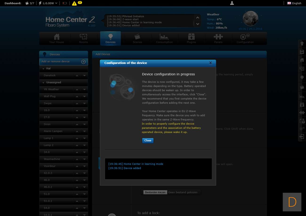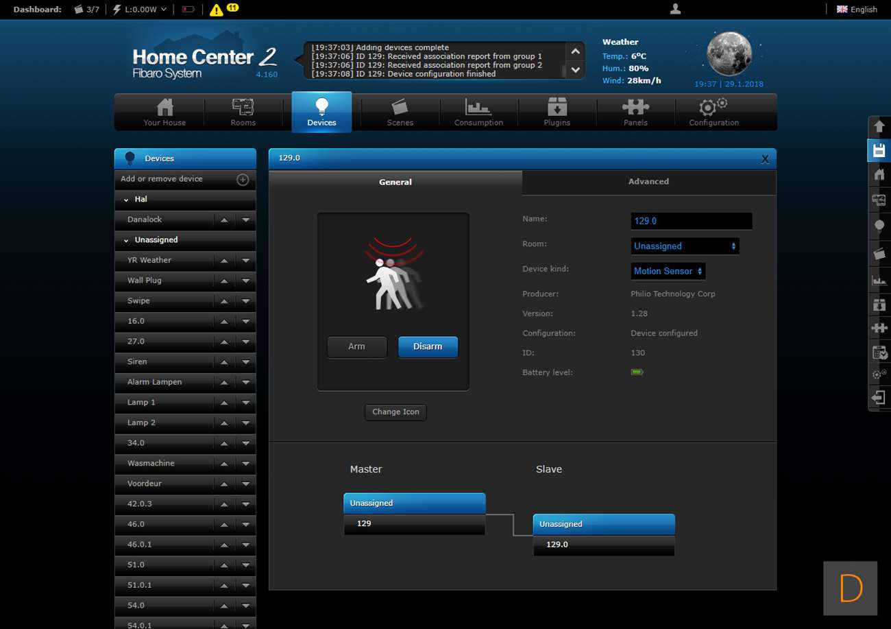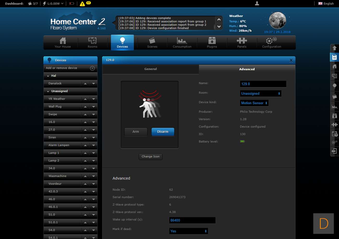 De volgende controller is de HC2. Deze geeft over het algemeen wat problemen met Philio producten. Dus we gaan zien of deze wel goed gaat. Je kunt het toevoegen starten door in te loggen en naar het apparaten gedeelte te gaan. Vervolgens klik je op "add new device" en hierna op add. Het toevoegen zal starten. Nu is het een kwestie van het verwijderen van het lipje bij de batterij. De LED zal aan de voorkant langzaam gaan knipperen. De sensor knipperde nog 1x kort en werd gevonden door de controller en toegevoegd. Mocht die om wat voor een reden dan ook niet starten met toevoegen dan kun je ook een paar keer drukken op het knopje op de achterkant van de sensor. Hij werd netjes gevonden en ik zie op het dashboard de bewegingsmelder verschijnen.