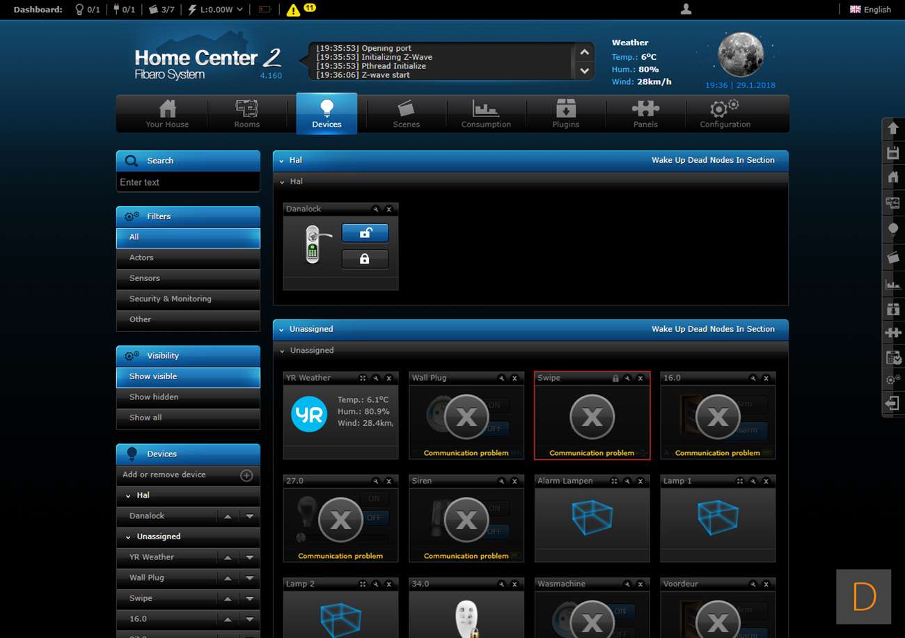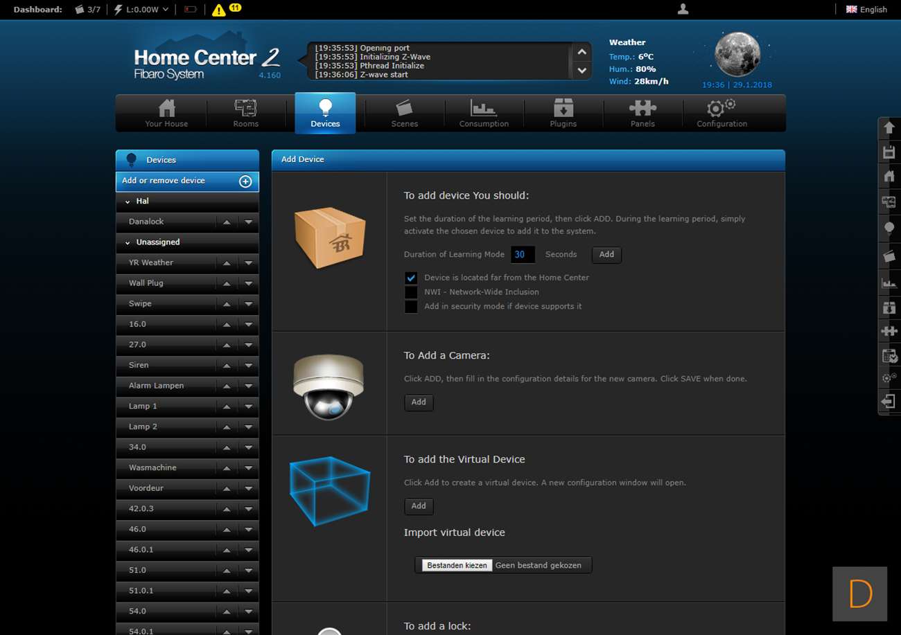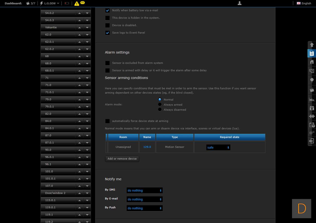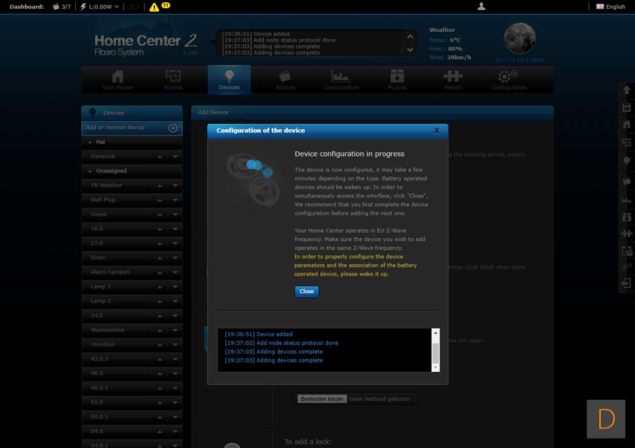 De volgende controller is de HC2. Deze geeft over het algemeen wat problemen met Philio producten. Dus we gaan zien of deze wel goed gaat. Je kunt het toevoegen starten door in te loggen en naar het apparaten gedeelte te gaan. Vervolgens klik je op "add new device" en hierna op add. Het toevoegen zal starten. Nu is het een kwestie van het verwijderen van het lipje bij de batterij. De LED zal aan de voorkant langzaam gaan knipperen. De sensor knipperde nog 1x kort en werd gevonden door de controller en toegevoegd. Mocht die om wat voor een reden dan ook niet starten met toevoegen dan kun je ook een paar keer drukken op het knopje op de achterkant van de sensor. Hij werd netjes gevonden en ik zie op het dashboard de bewegingsmelder verschijnen.