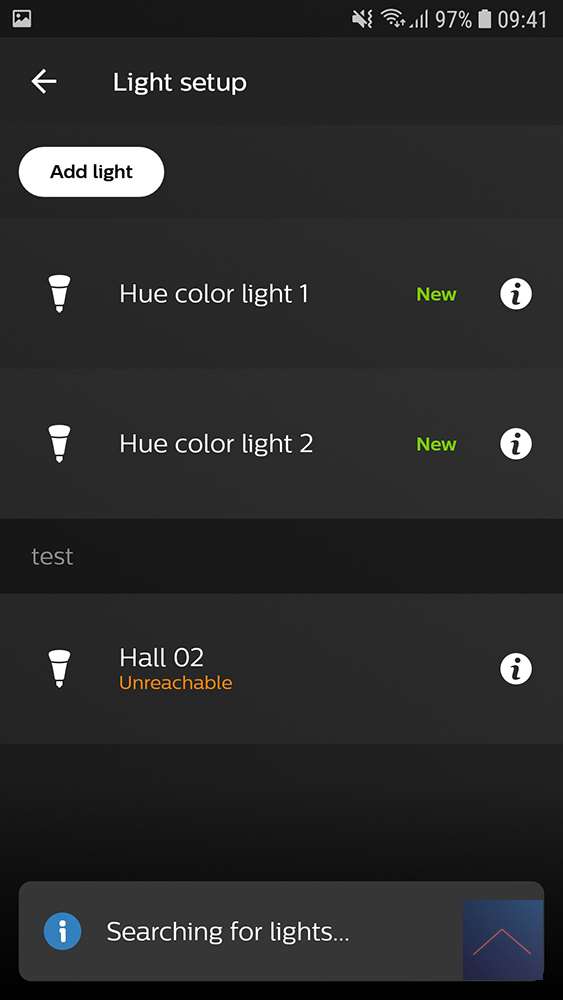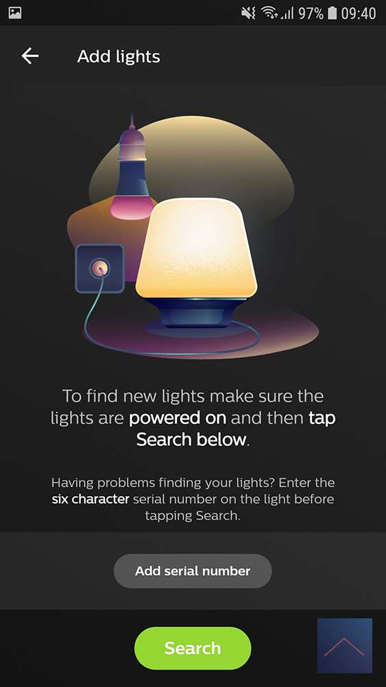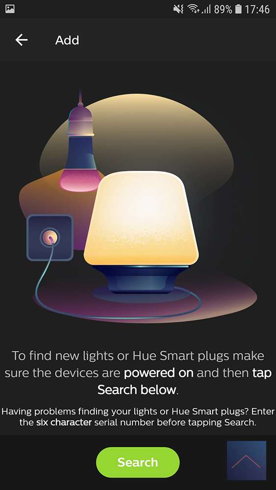 Het toevoegen van Philips Hue lampen, toebehoren en andere merken doe je in de App, ga eerst naar de settings tab onderin en dan kun je kiezen voor “Light setup” of voor “Acccessory setup”. Kies voor “Add light” of “Add accessory” en je krijgt dan een korte uitleg, selecteer dan “Search” om de Bridge te laten zoeken. Bij het toevoegen van een lamp heb ook nog de keuze om het handmatige het serie nummer in te voeren. Als je dit doet zul je nog steeds moeten zoeken.