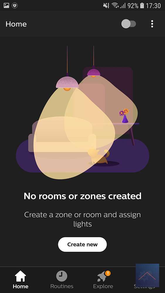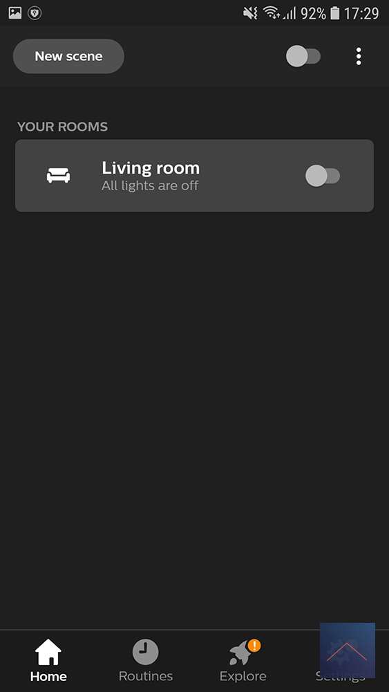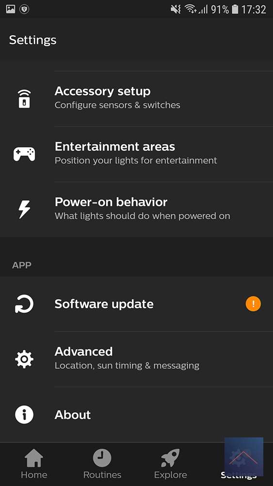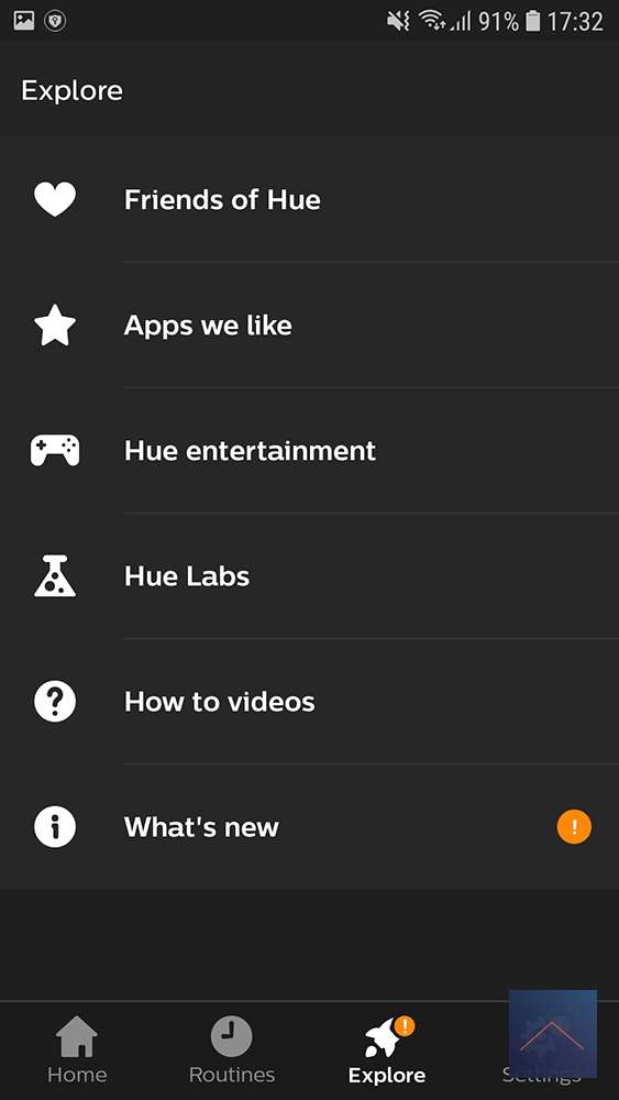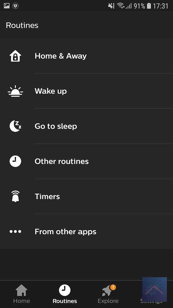 De hoofd tabs staan onderin; Home, Routines, Explore en Settings.
