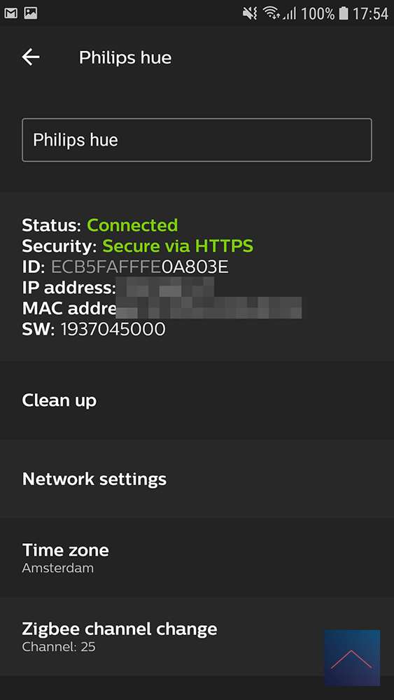 Hier kun je zien welke Hue Bridges je hebt gekoppeld met je App, dit kunnen er dus meer dan 1 zijn. Als je op de i klikt krijg je extra info over de Bridge en kun je vier zaken regelen: Clean up, Network settings, Time zone en Zigbee channel change.