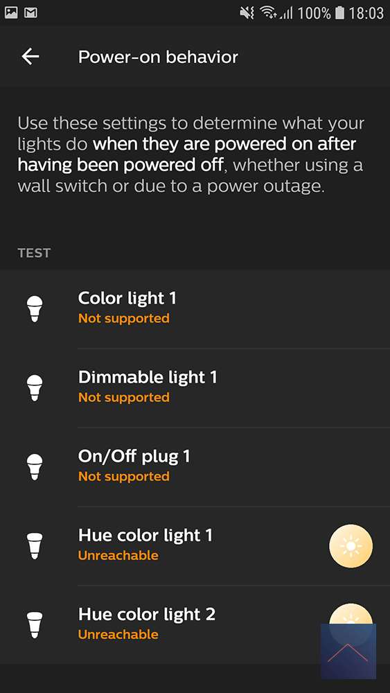 Hier kun je instellen wat een licht moet doen als je stroom is uitgevallen en er dan weer op komt of wanneer je de lamp met de wandschakelaar hebt uitgezet en deze weer aan zet.