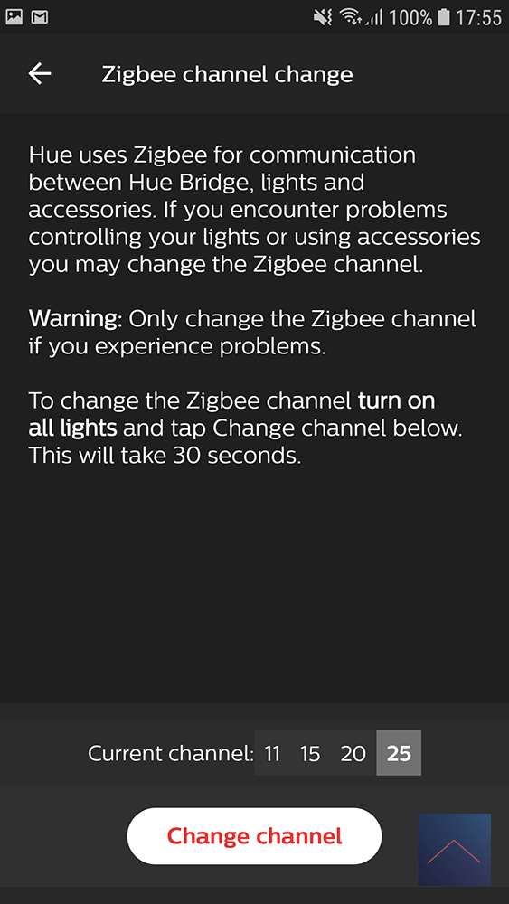 Met de Zigbee channel change kun je het kanaal van de Zigbee aanpassen. Dit zou je kunnen gebruiken als je bijvoorbeeld last hebt om connecties te maken. Het Zigbee protocol gebruikt namelijk de zelfde kanaal als wifi en dit kan soms botsen.