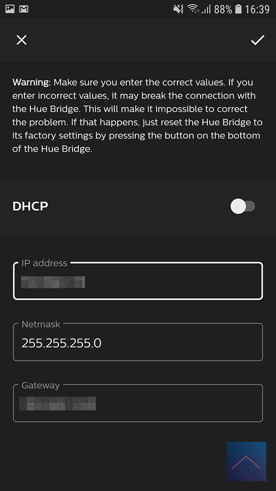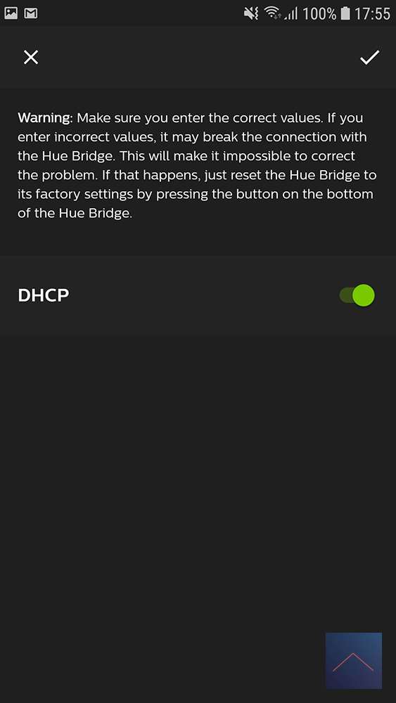 Met Network settings kun je DHCP aan laten staan als je wilt dat je Bridge automatisch een IP adres krijgt of je kunt dit uitzetten en dan kun je deze informatie er zelf inzetten.