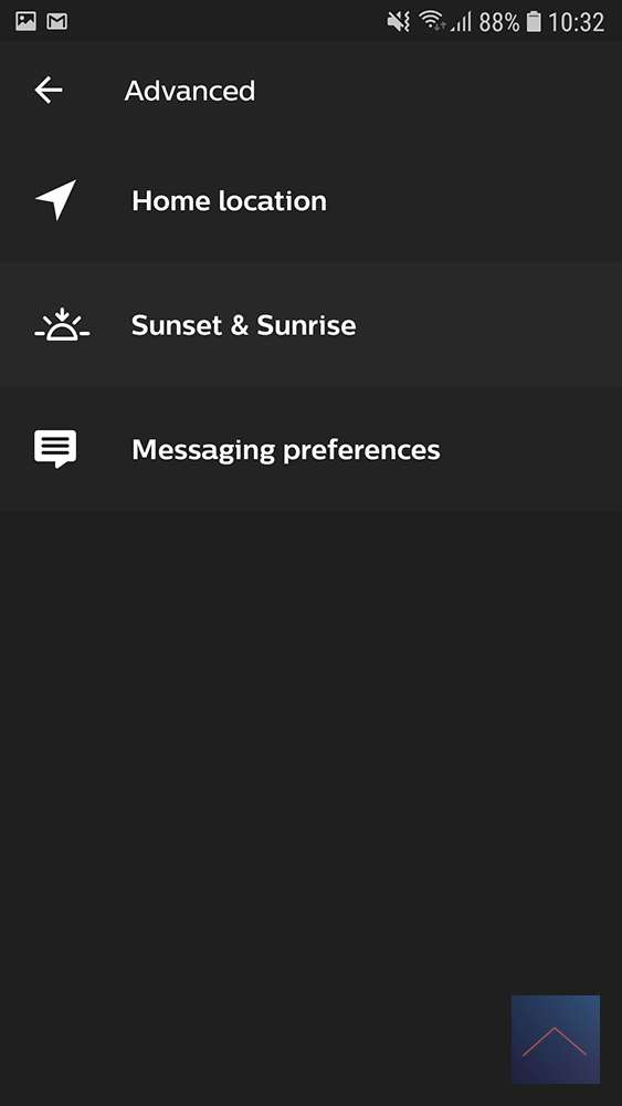 Hier heb je drie opties: Home location, Sunset & Sunrise en Messaging preferences.