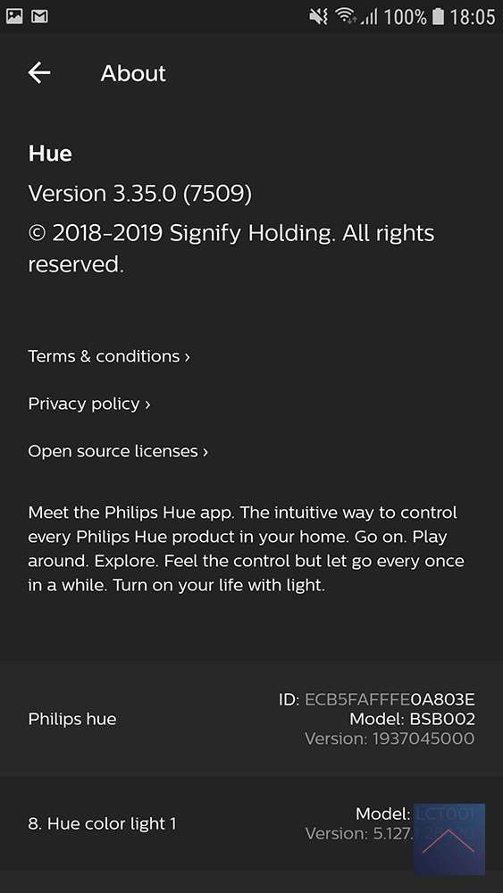 Hier kun je informatie vinden over de Hue versie, model, ID, Terms & conditions, Privacy policy en Open source licenses.