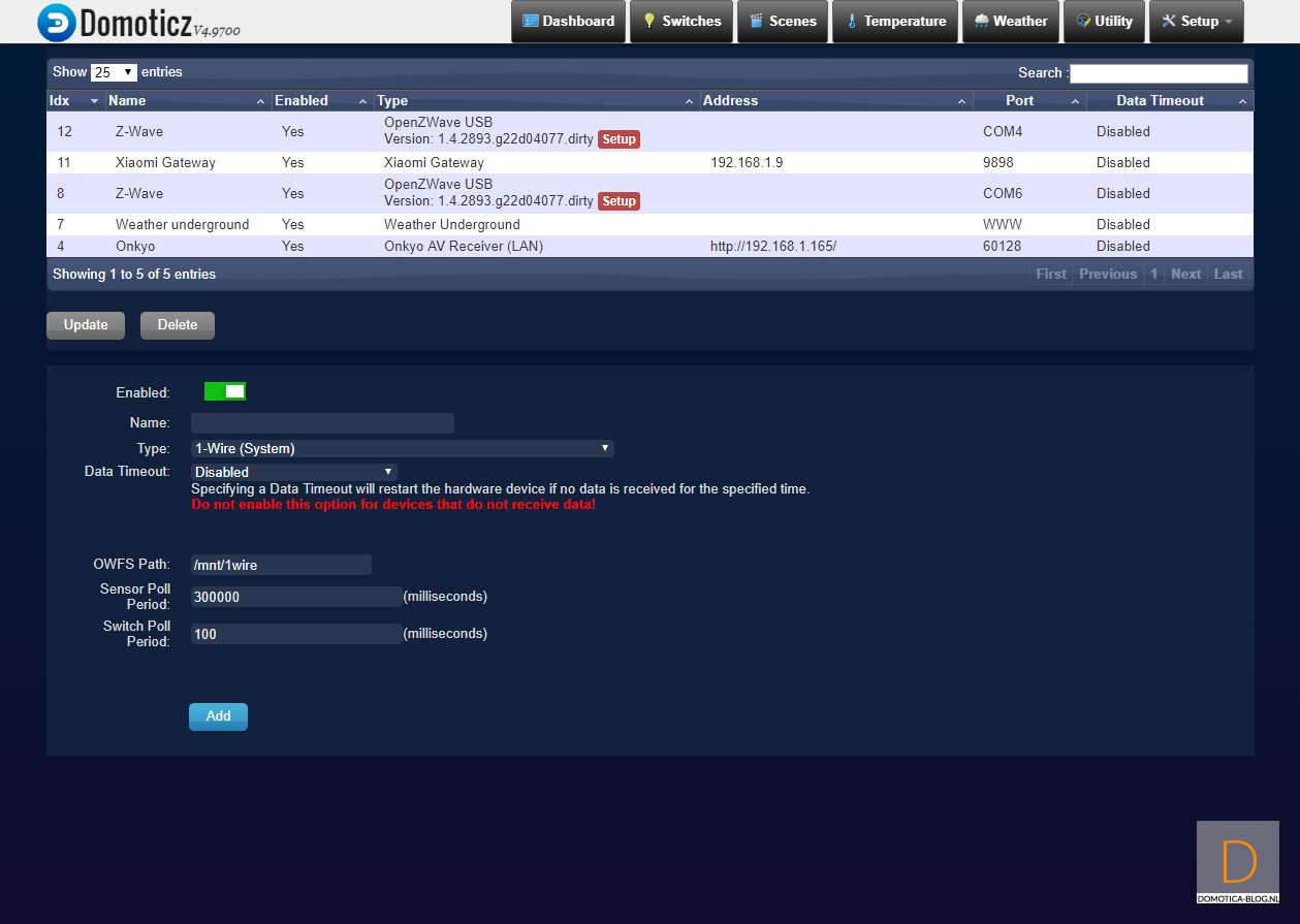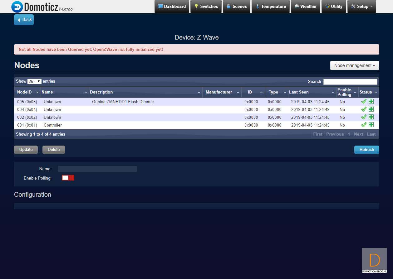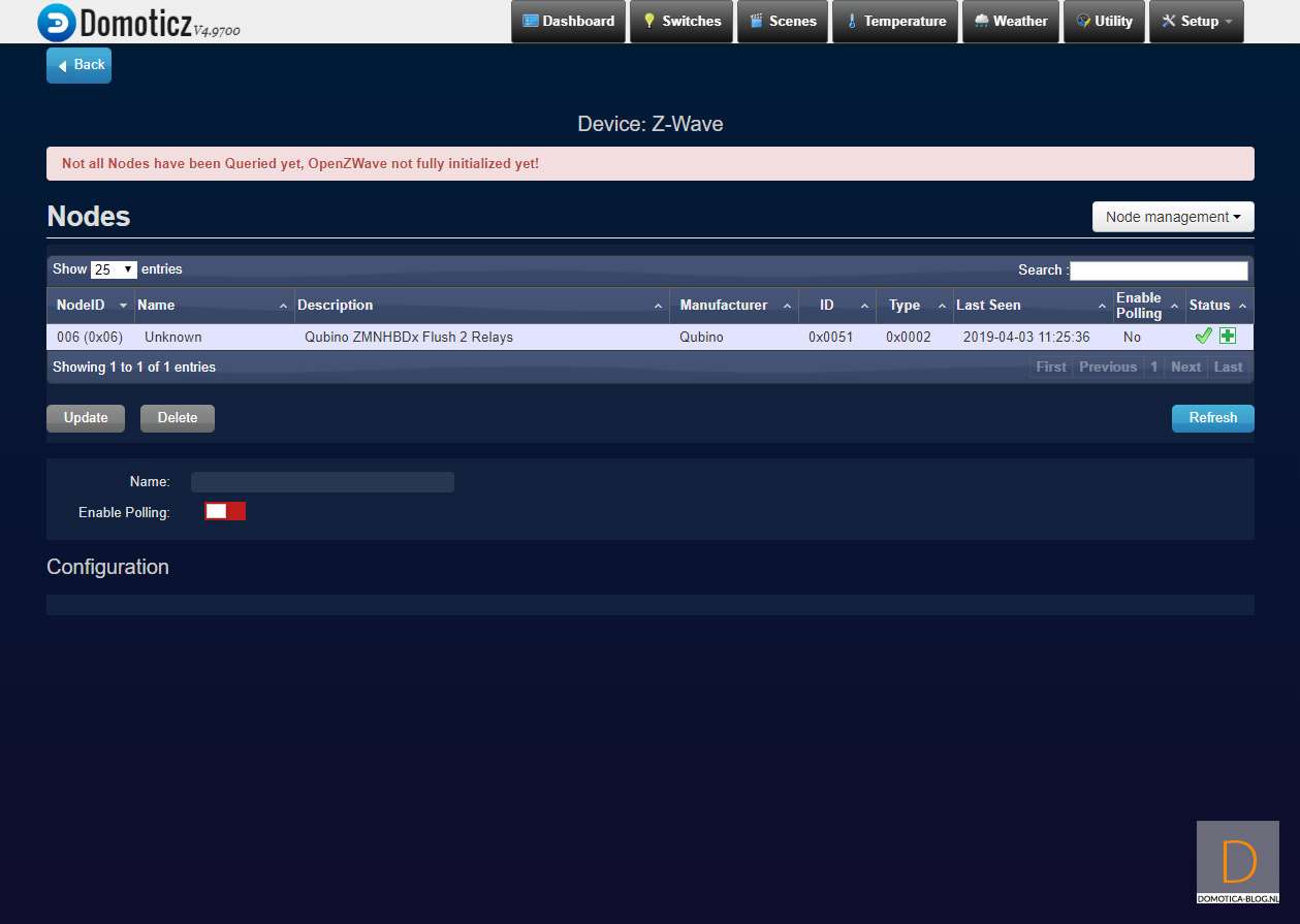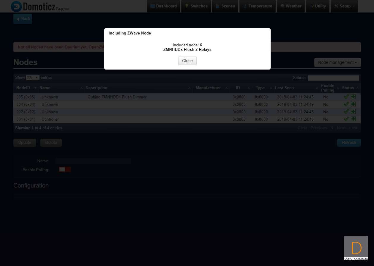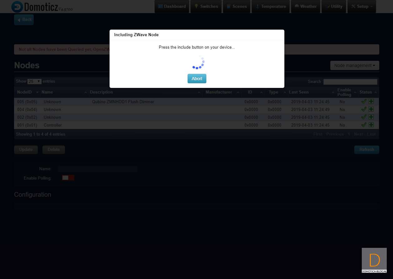 Als ene laatste controller is domoticz aan de beurt. Je kunt de Qubino toevoegen door naar Setup en hardware te gaan. Ik voeg hem via de Aeon Labs Z-Wave USB stick toe. Dus ik klik daar op setup. Vervolgens ga ik naar de rechterkant en klik in het menu op "include node secure". Daarna moet je de module voorzien van stroom of het knopje aan de voorkant 2 seconden lang ingedrukt houden. Zorg dat je de module bij de controller in de buurt houdt.