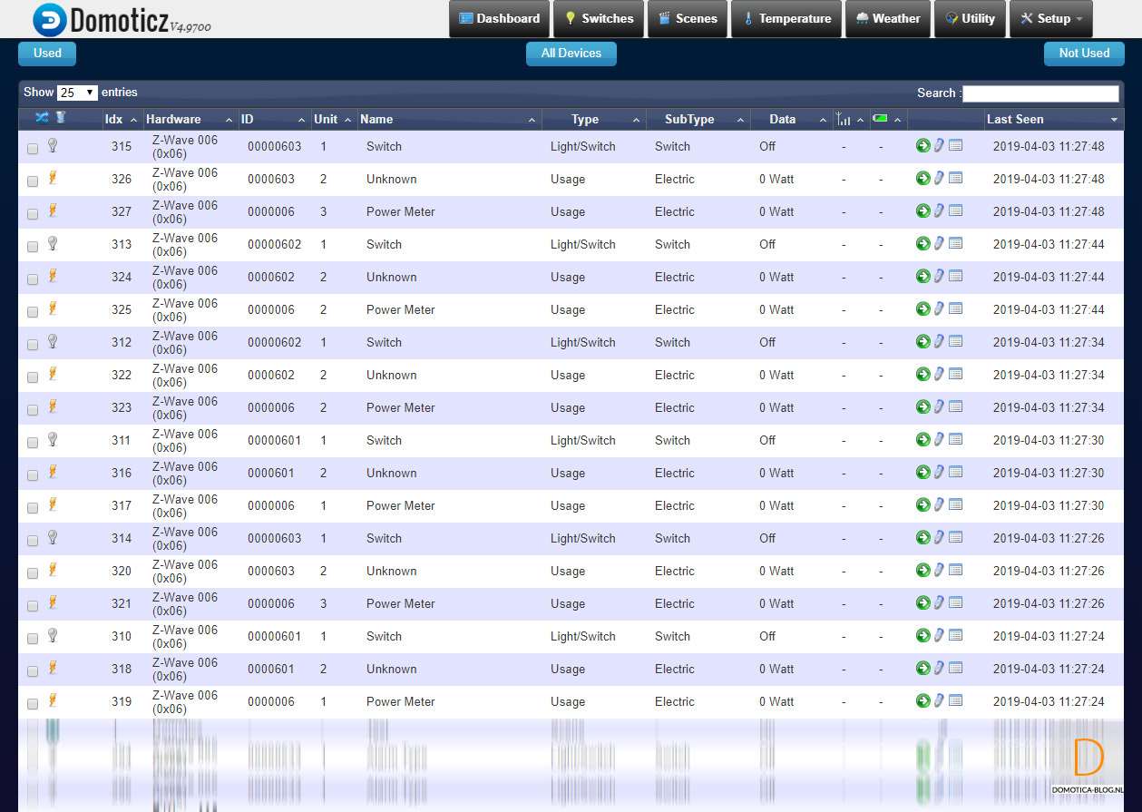 Ik zie hem netjes verschijnen bij mijn apparaten. Er zijn 4 schakelaars met: aan/uit, totaal verbruik en huidig verbruik. Hierbij werken er twee, dus je moet wel even uitzoeken welke schakelaar bij welke lamp hoort. Helaas zie ik geen totaal verbruik en totaal verbruik binnenkomen.