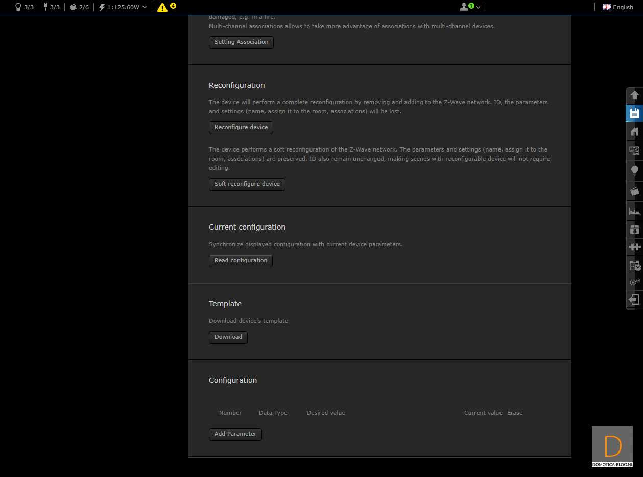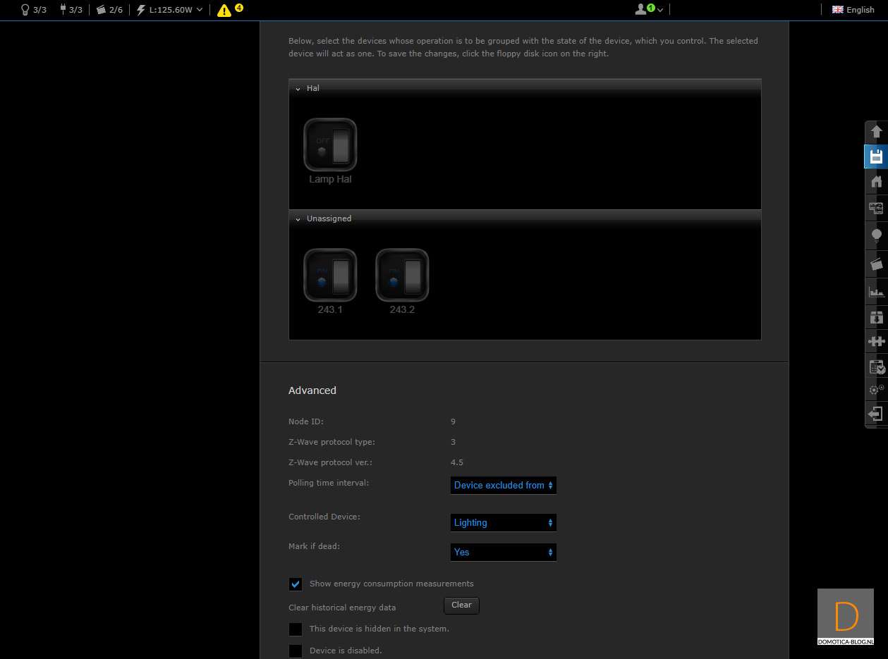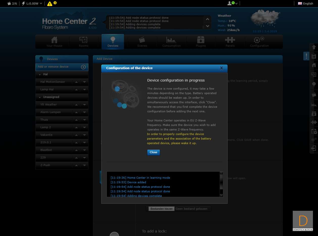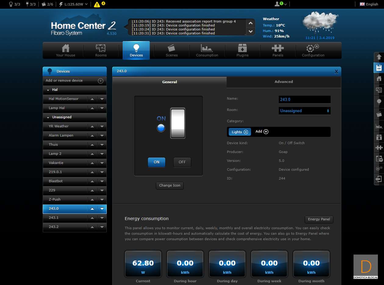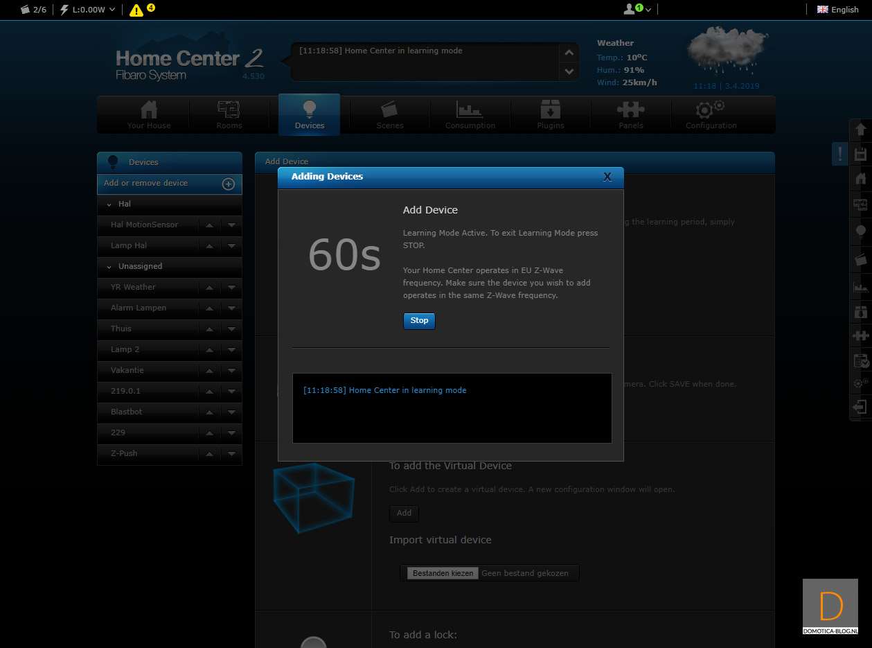 Als eerste zorg je dat de installatie draden op de juiste manier worden aangesloten en dat de module van stroom word voorzien. Om het toevoegen te starten log je in op je Home Center. Vervolgens ga je naar het device gedeelte en klik je op "add or remove device" en vervolgens op de "add" knop. Het aftellen zal beginnen. Hij zal hierna gevonden worden, mocht dit niet het geval zijn dan moet je even het (S) knopje aan de voorkant van de module 2 seconden ingedrukt houden. Zorg altijd dat je dichtbij de controller bent als je gaat toevoegen. Hij werd netjes gevonden en toegevoegd aan de HC2. Er zijn 2 schakelaars met: aan/uit, totaal verbruik en huidig verbruik. Er is ook 1 schakelaar welke als hoofd dient, hiermee kun je alles aan- en uitzetten. Via de configuratie zijn de parameters te beheren. Dit scheelt weer zoeken in de handleiding.