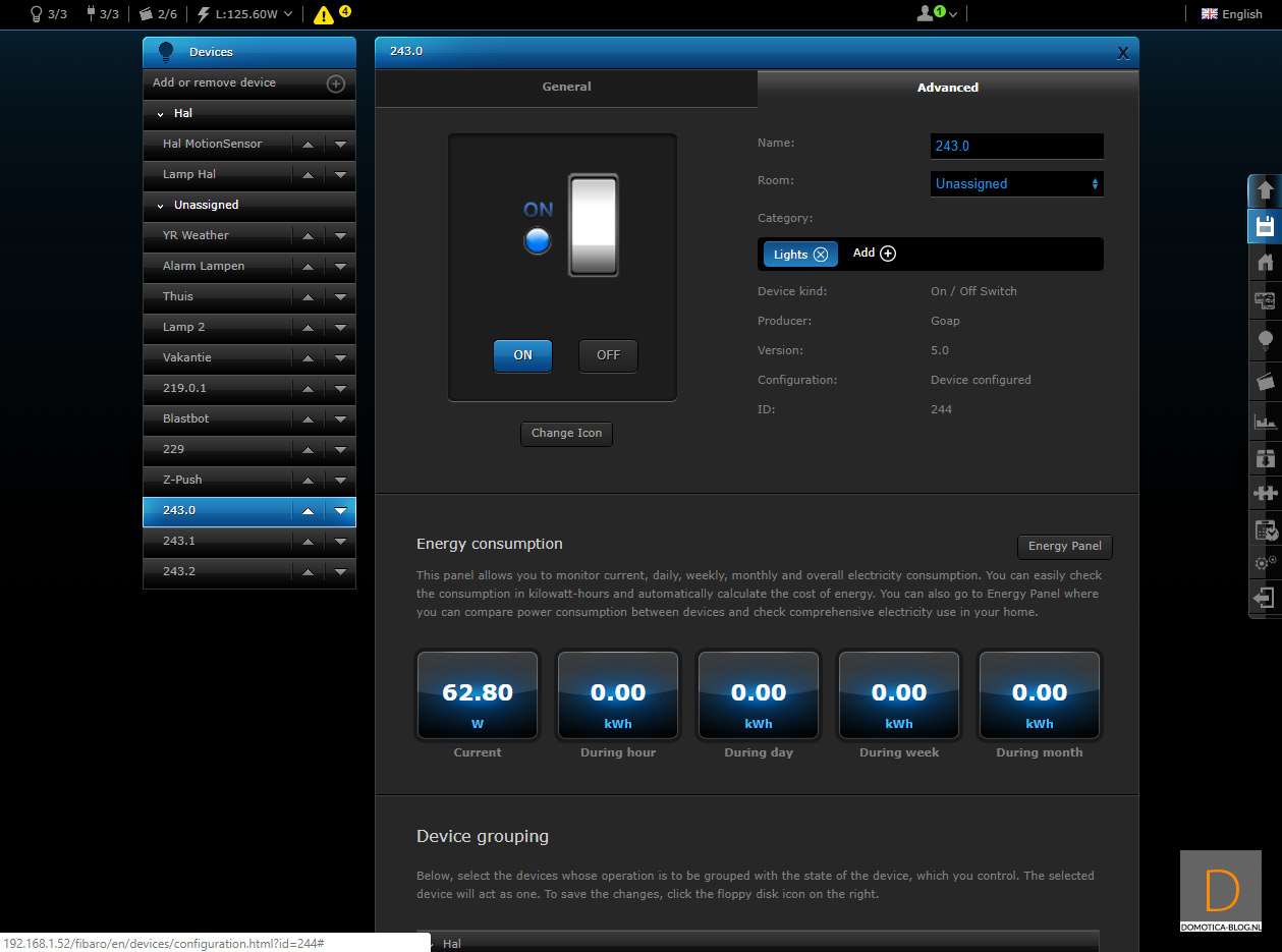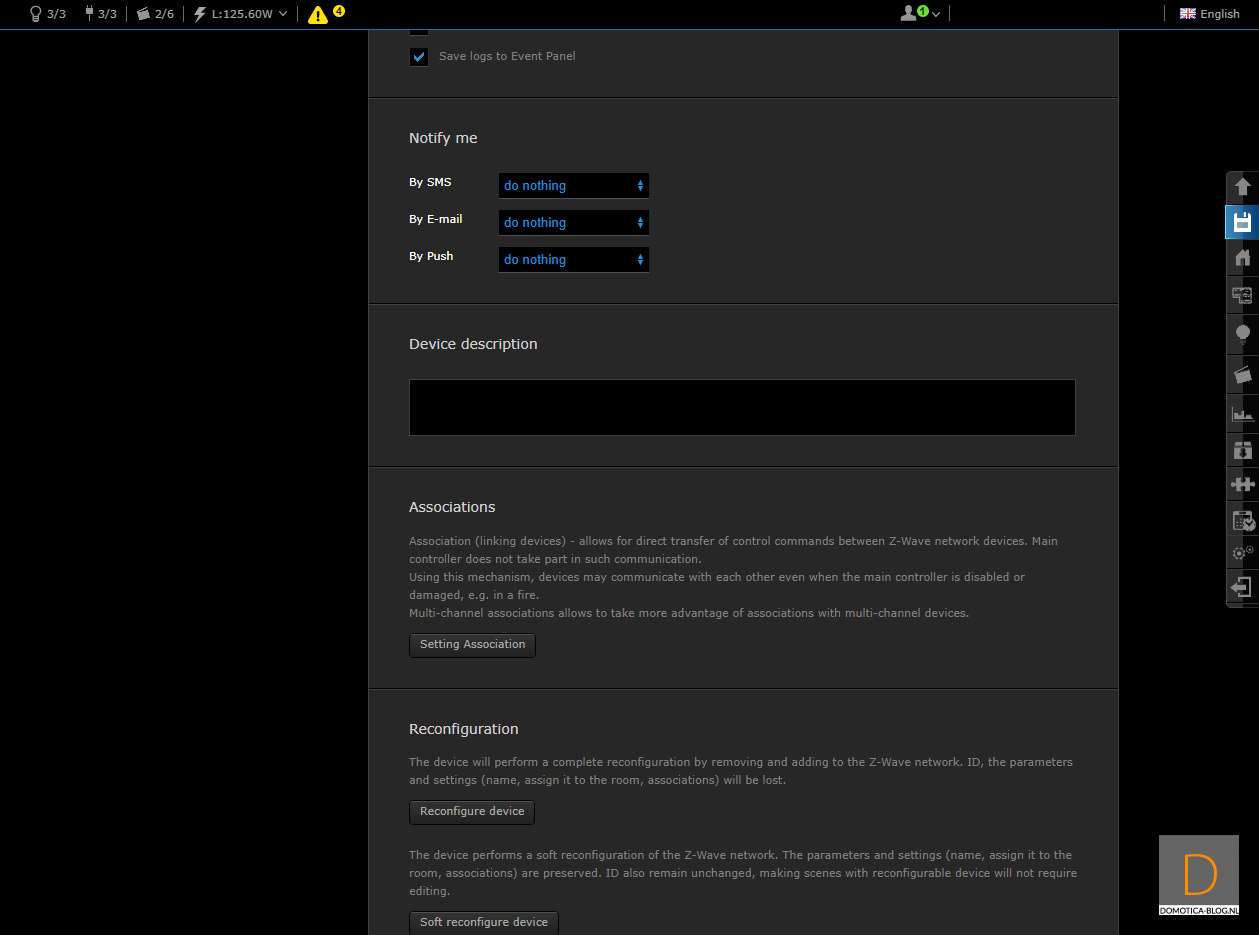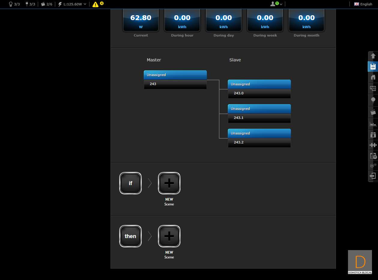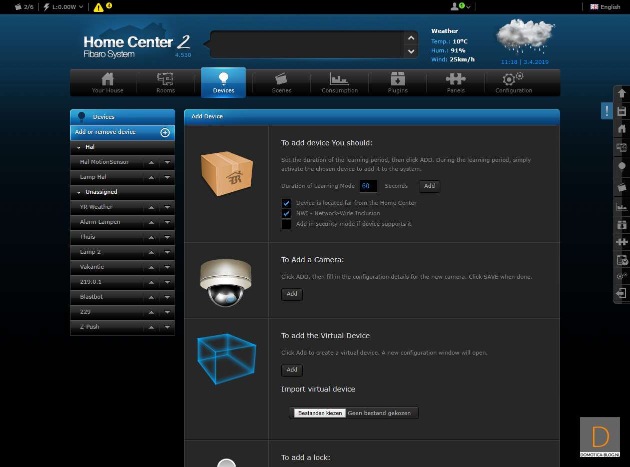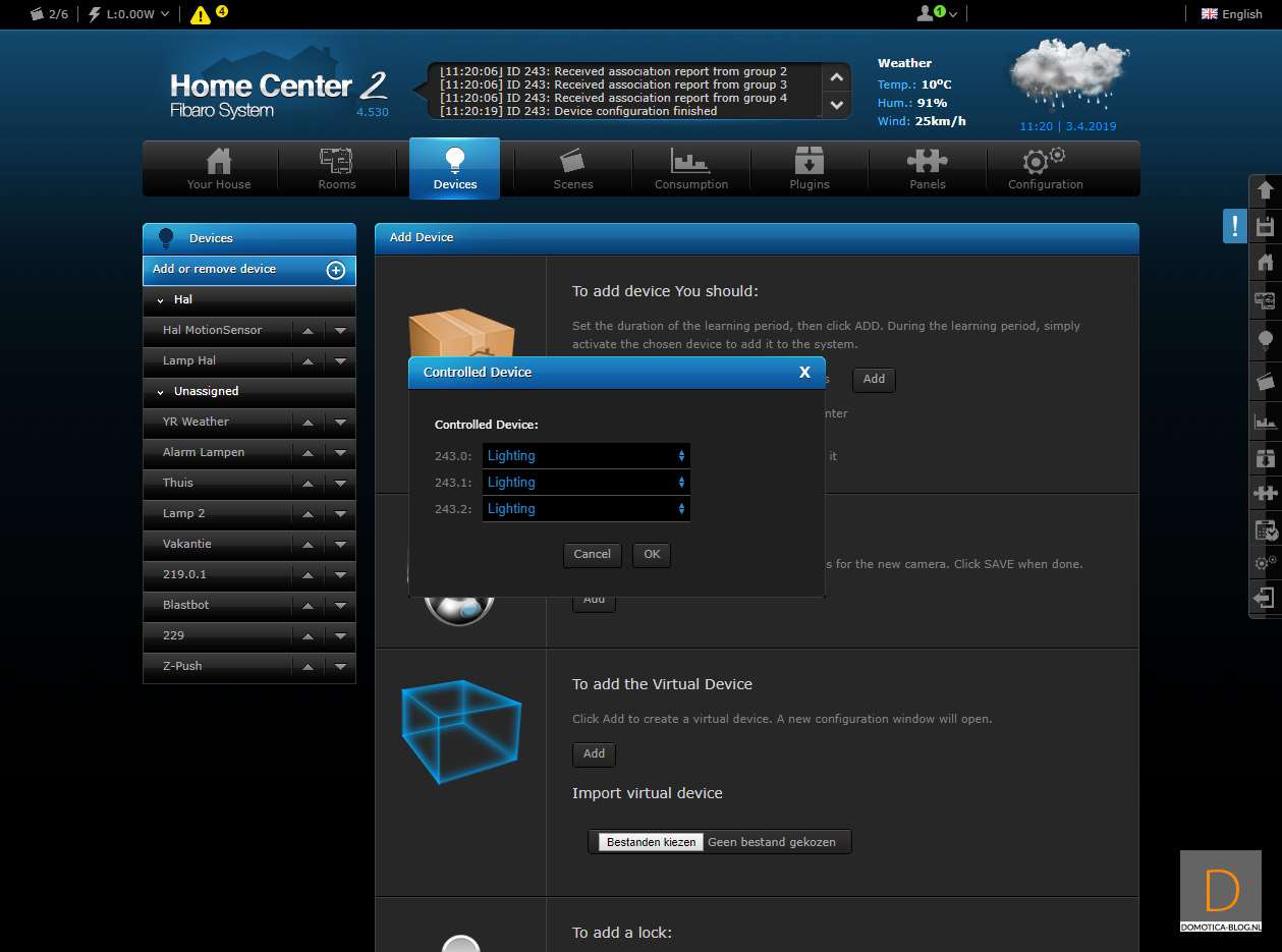Als eerste zorg je dat de installatie draden op de juiste manier worden aangesloten en dat de module van stroom word voorzien. Om het toevoegen te starten log je in op je Home Center. Vervolgens ga je naar het device gedeelte en klik je op "add or remove device" en vervolgens op de "add" knop. Het aftellen zal beginnen. Hij zal hierna gevonden worden, mocht dit niet het geval zijn dan moet je even het (S) knopje aan de voorkant van de module 2 seconden ingedrukt houden. Zorg altijd dat je dichtbij de controller bent als je gaat toevoegen. Hij werd netjes gevonden en toegevoegd aan de HC2. Er zijn 2 schakelaars met: aan/uit, totaal verbruik en huidig verbruik. Er is ook 1 schakelaar welke als hoofd dient, hiermee kun je alles aan- en uitzetten. Via de configuratie zijn de parameters te beheren. Dit scheelt weer zoeken in de handleiding.