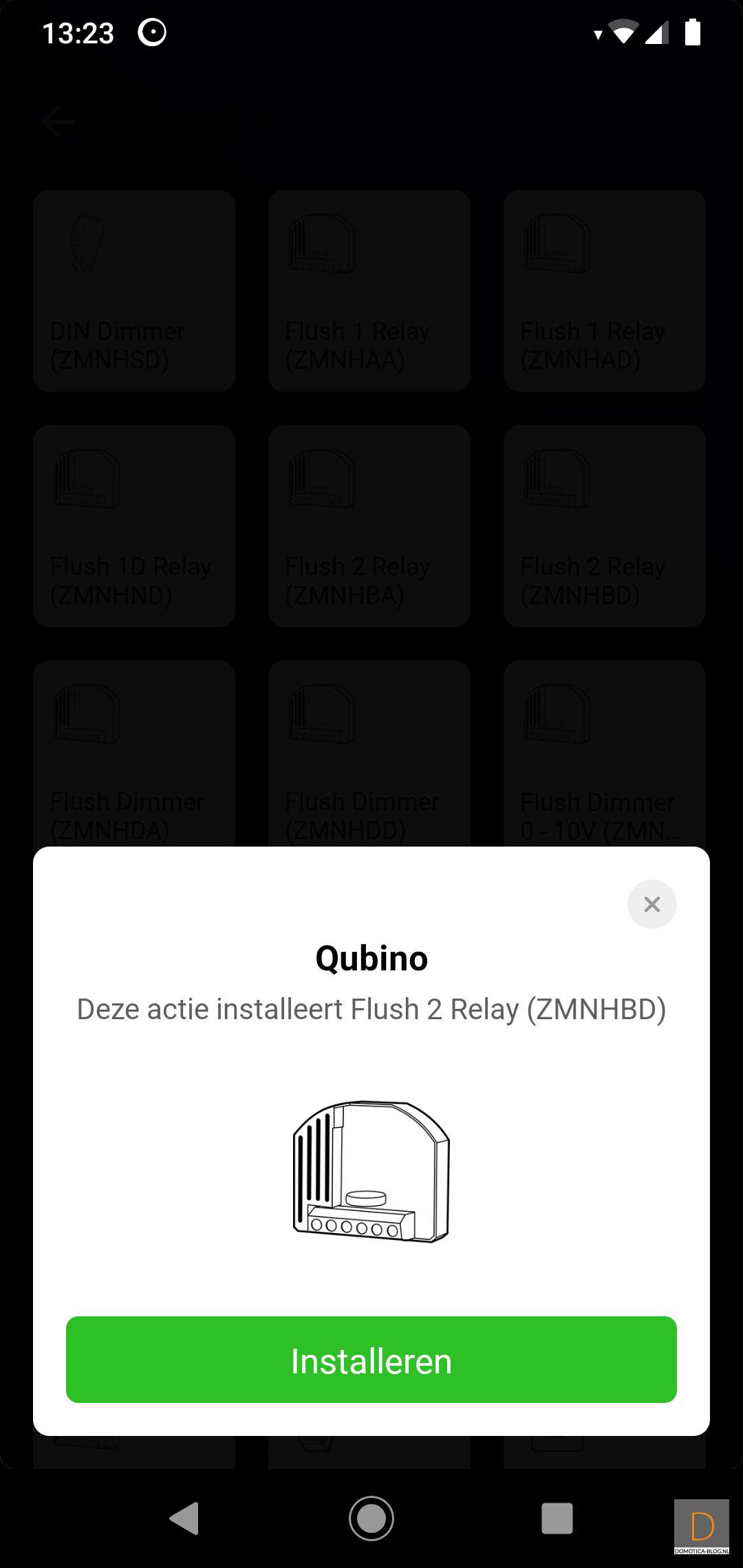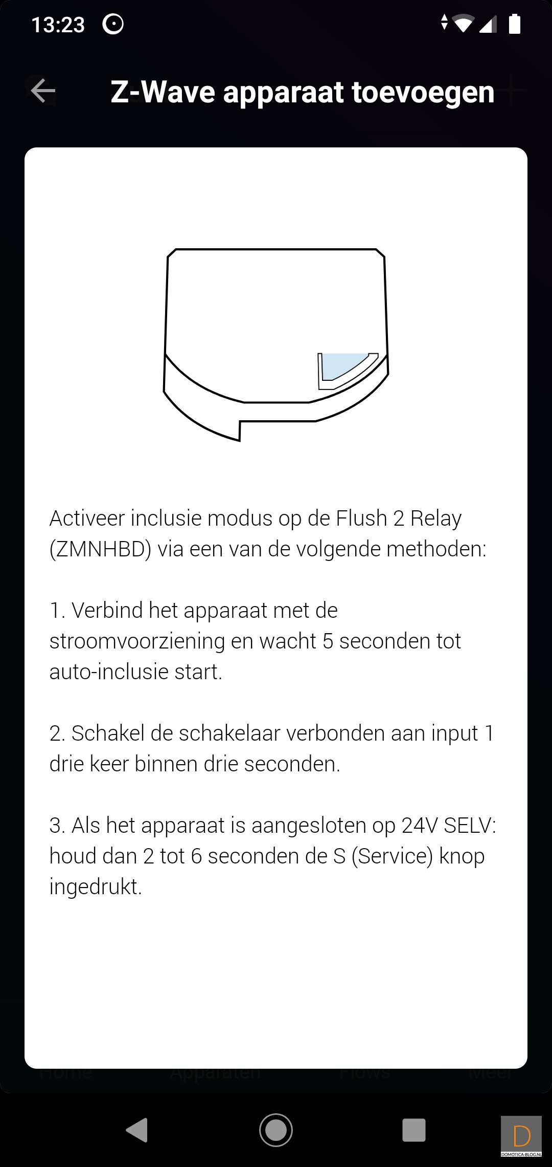 Als eerste is het zaak om de installatiedraden op de juiste manier aan te sluiten. Hiervoor wordt een schema bijgeleverd. Als je deze hebt aangesloten, log je in op je Homey. Je gaat vervolgens naar de apparaten en klikt op de (+). Hierna moet je Qubino APP installeren (als dit dit niet al gedaan hebt) en de Qubino Flush 2 relay (ZMNHBD1) opzoeken. Let op dat je de juiste versie pakt (er zijn er namelijk 2). De controller zal nu in de leerstand gezet worden. Omdat je de module al van stroom hebt voorzien zal hij automatisch gevonden worden, mocht dit niet het geval zijn dan moet je de (S) knop op de module 2 seconden lang ingedrukt houden.