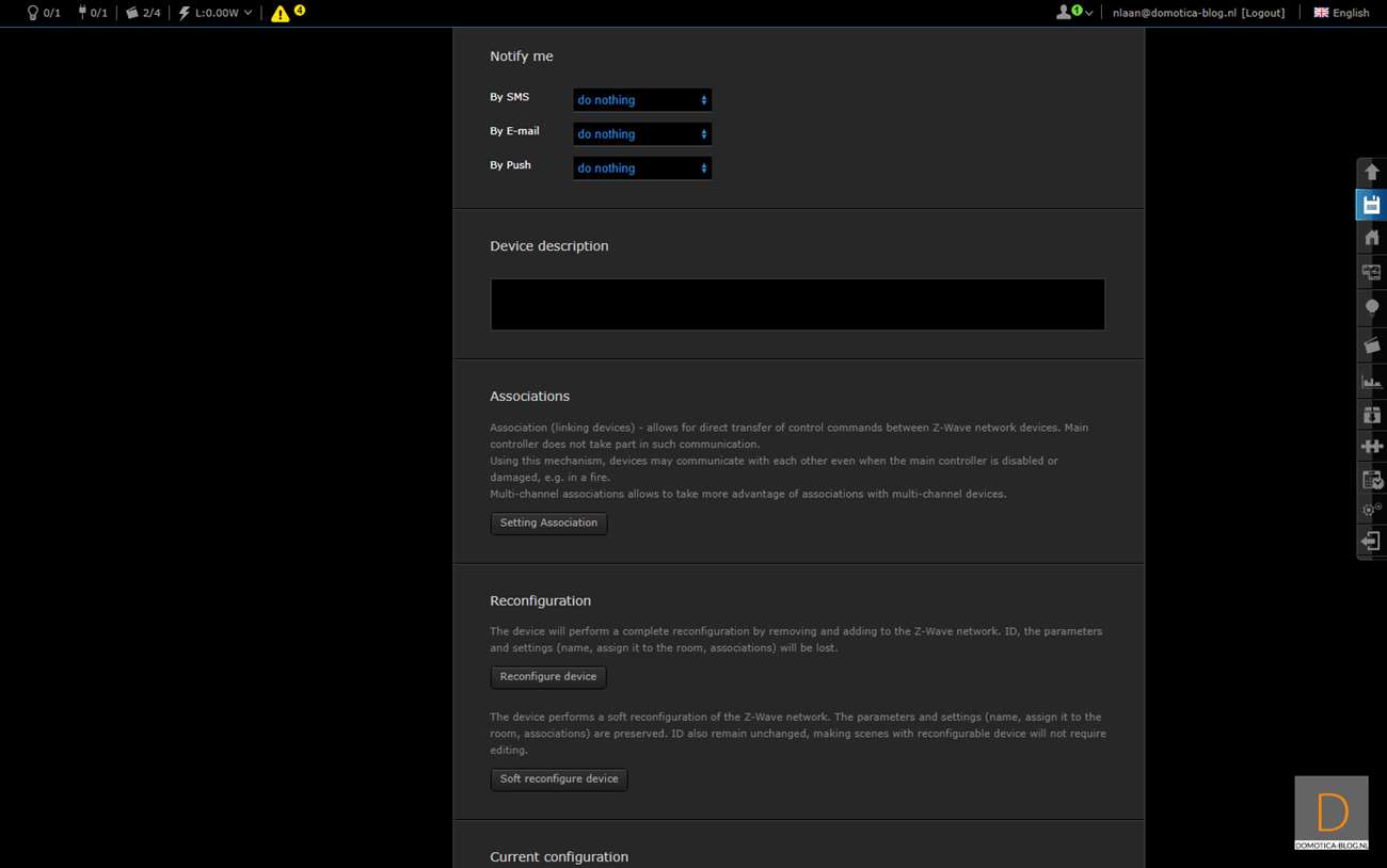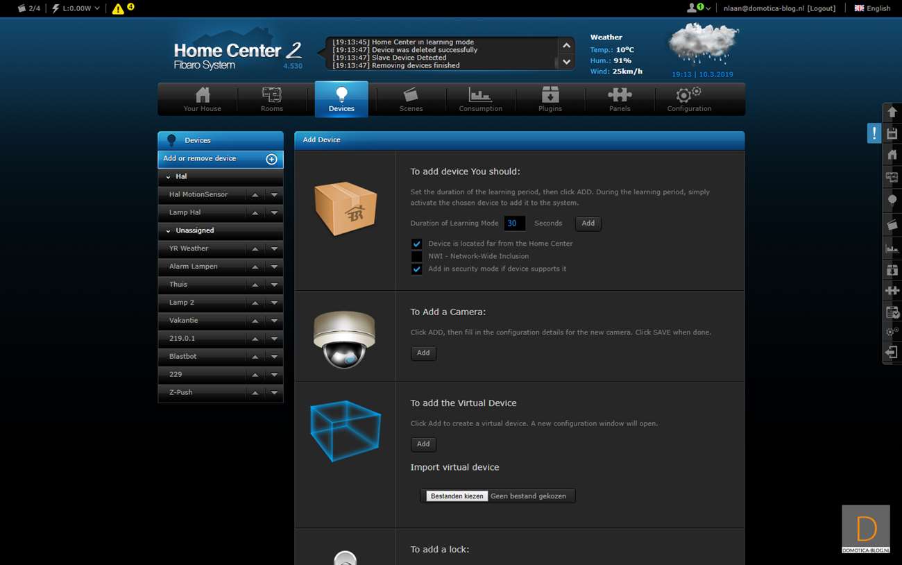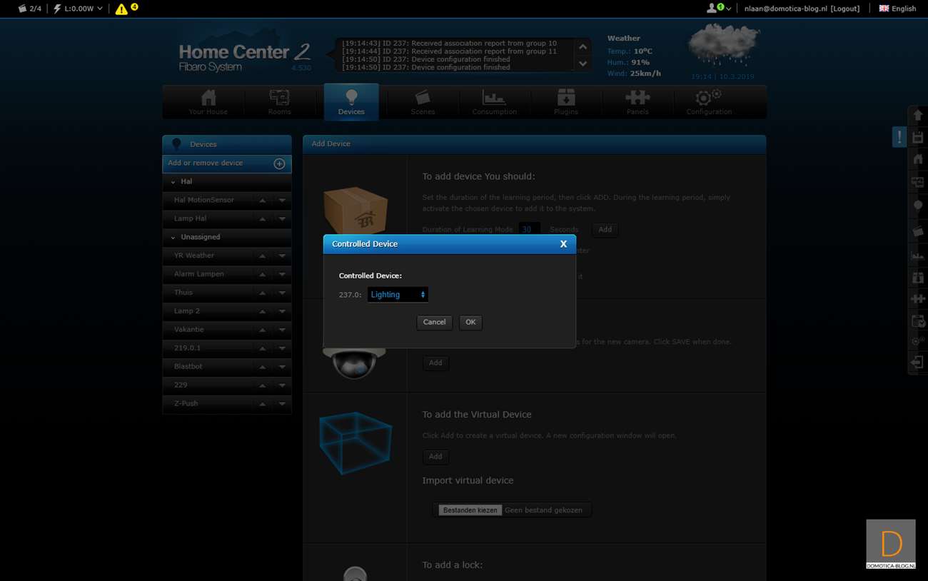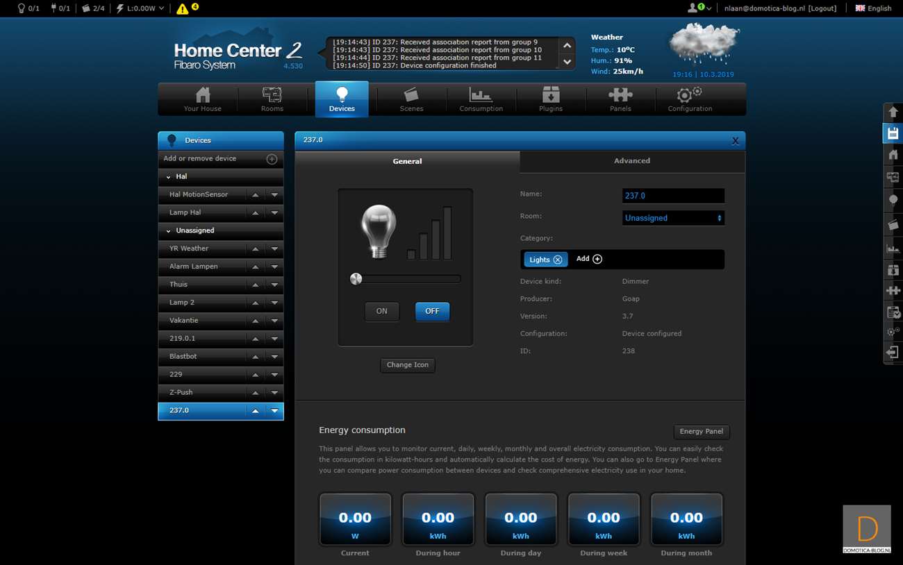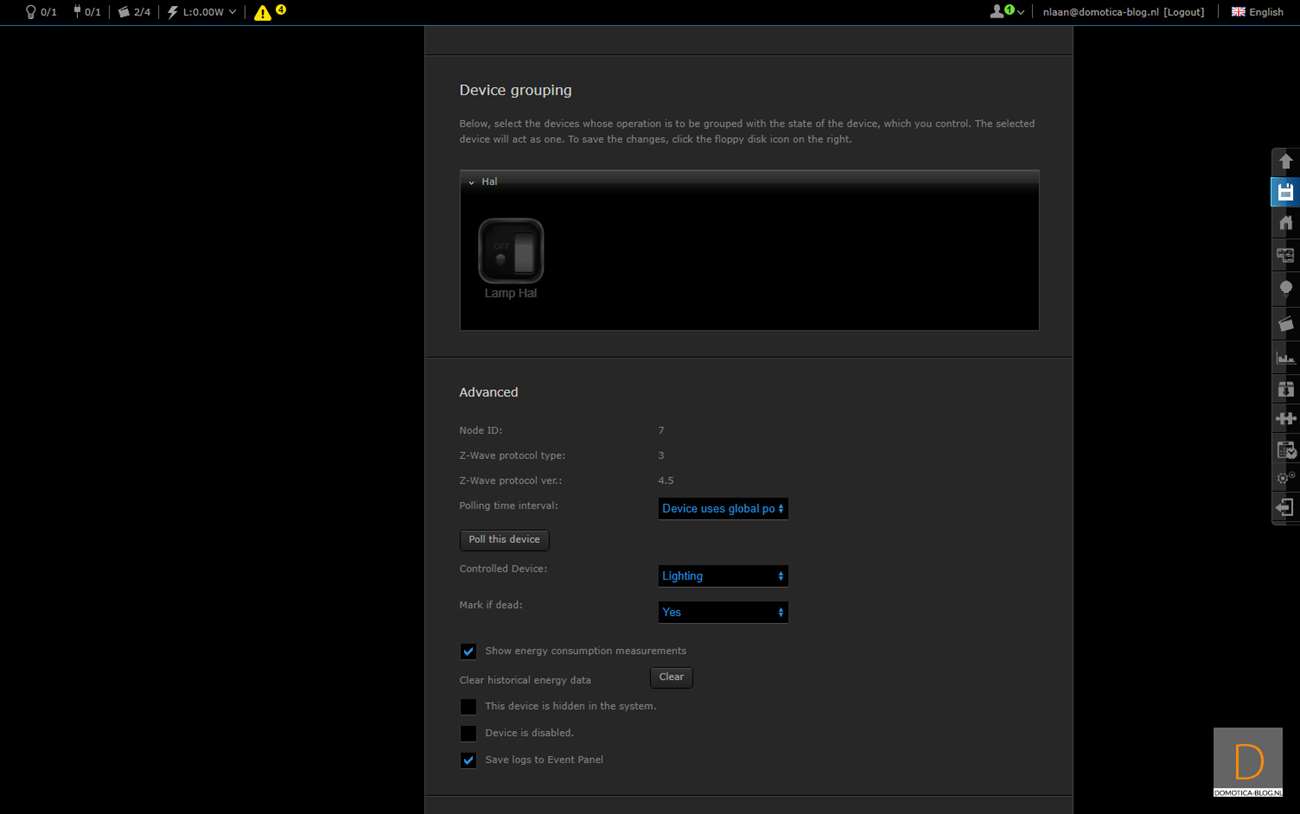Het toevoegen van deze dimmer gaat door in te loggen op de HC2 en naar het device gedeelte te gaan. Vervolgens klik je op "add new device" en hierna op add. De toevoegen procedure zal starten. De module zal 5 sec. zichtbaar blijven als hem van stroom te voorziet. Mocht dit niet het geval zijn dan moet je even 3x snel achter elkaar op het blauwe knopje op de achterkant van de module drukken. Hij werd netjes gevonden door de HC2 en zie hem verschijnen op de apparaten. Ik zie een schakelaar (aan/uit) het lichtnivo, het totaal verbruik en het huidige verbruik.