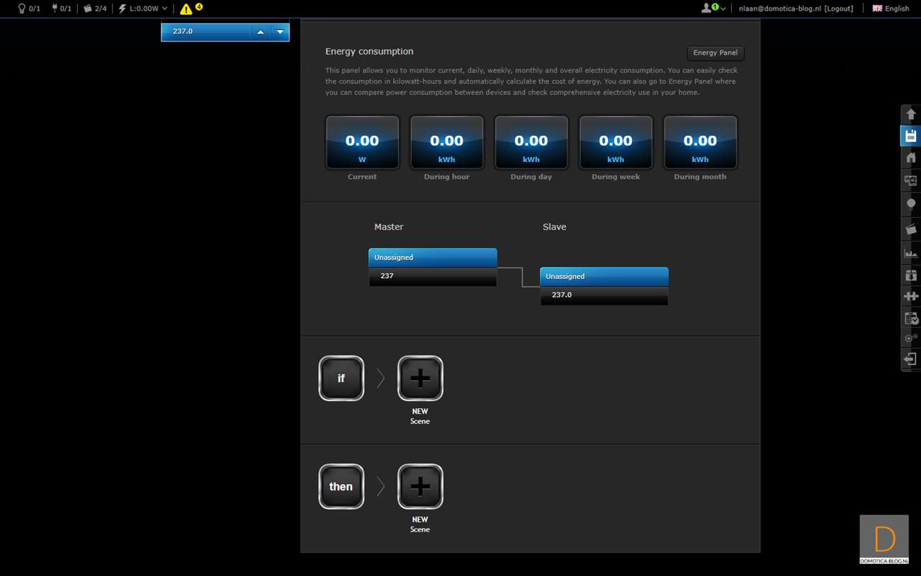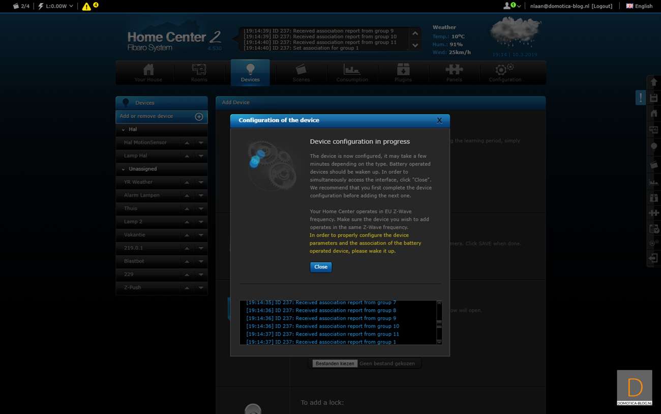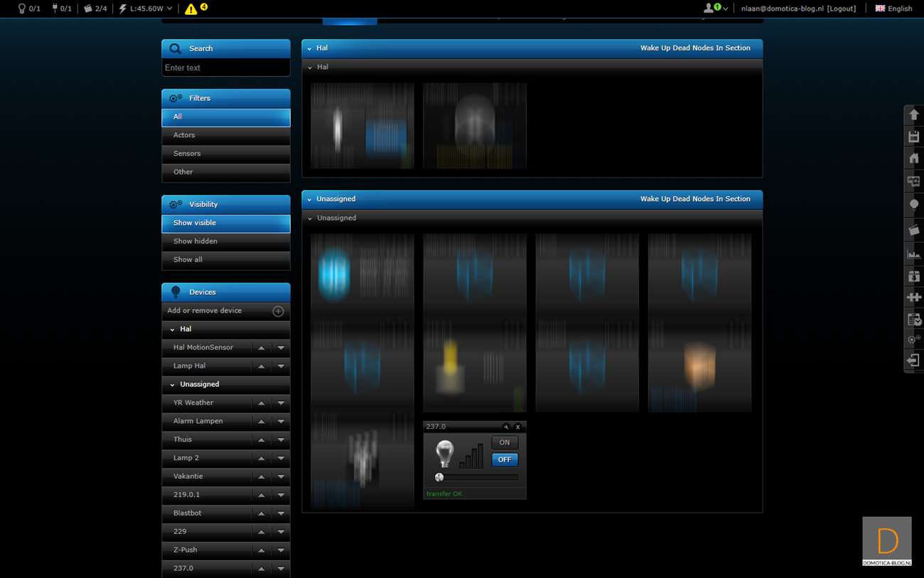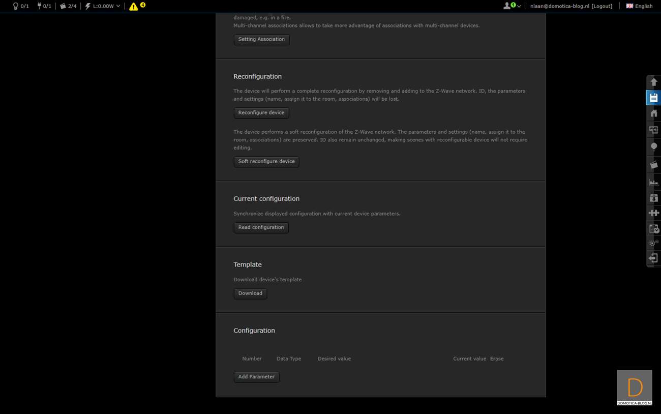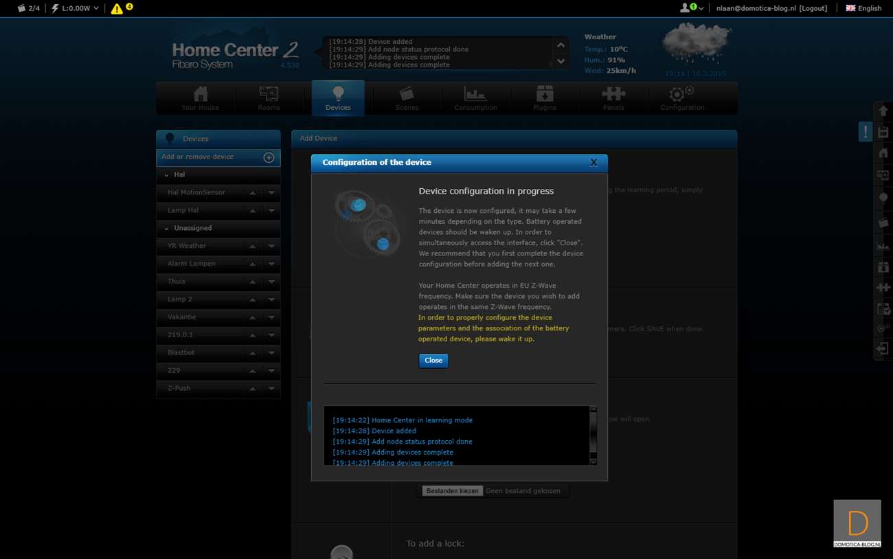 Het toevoegen van deze dimmer gaat door in te loggen op de HC2 en naar het device gedeelte te gaan. Vervolgens klik je op "add new device" en hierna op add. De toevoegen procedure zal starten. De module zal 5 sec. zichtbaar blijven als hem van stroom te voorziet. Mocht dit niet het geval zijn dan moet je even 3x snel achter elkaar op het blauwe knopje op de achterkant van de module drukken. Hij werd netjes gevonden door de HC2 en zie hem verschijnen op de apparaten. Ik zie een schakelaar (aan/uit) het lichtnivo, het totaal verbruik en het huidige verbruik.