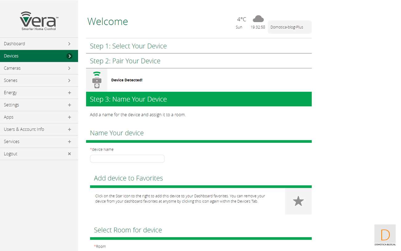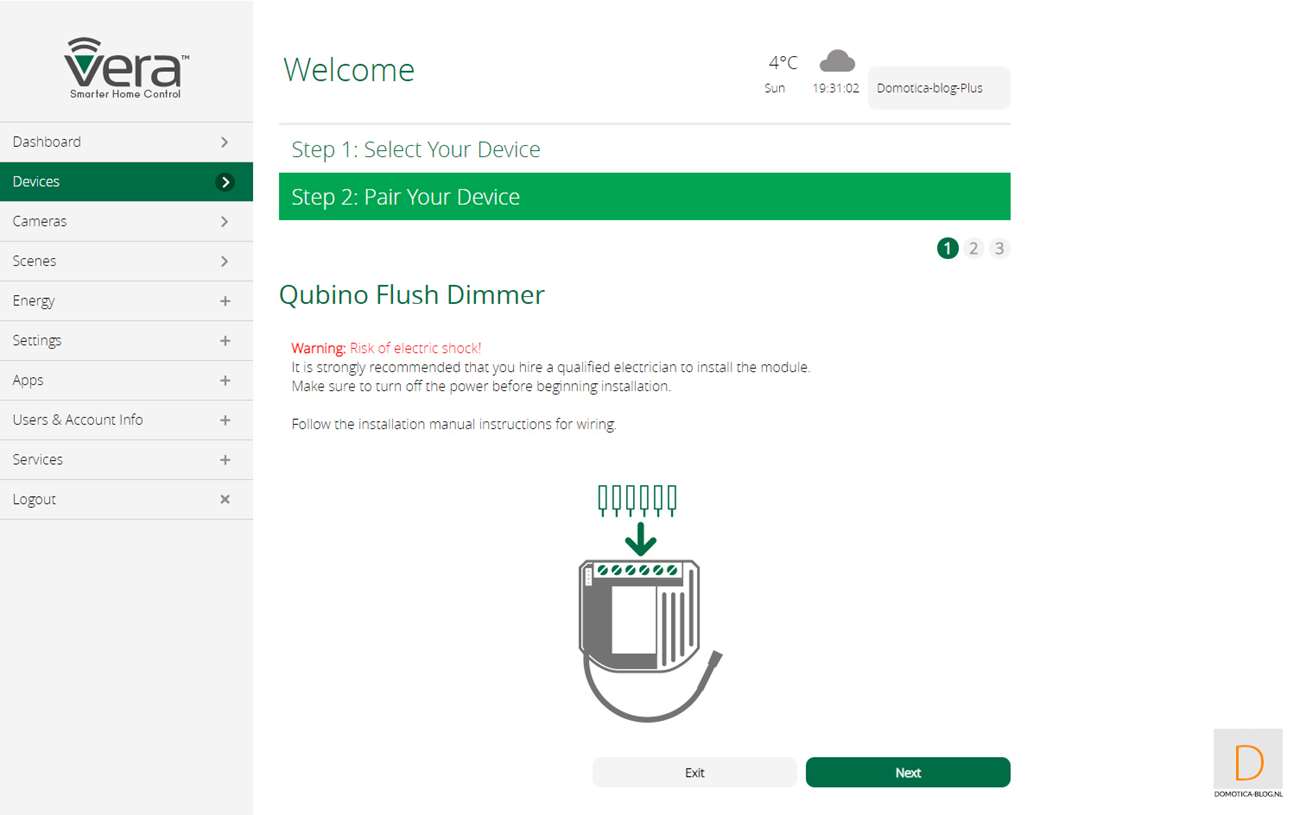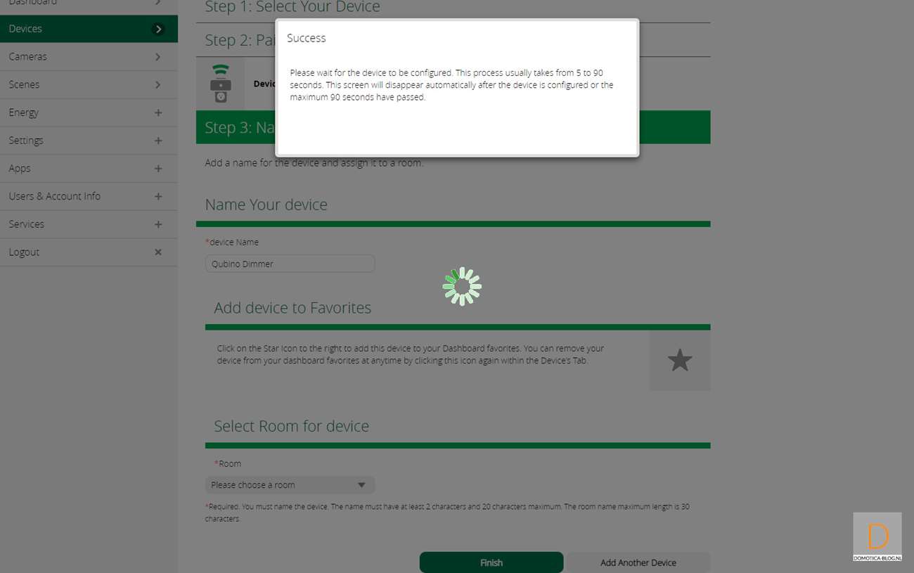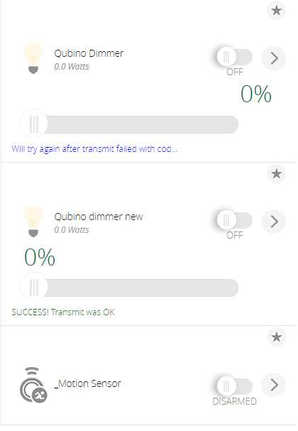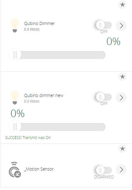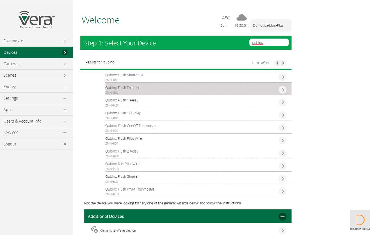 Volgende controller waar we de module op gaan testen is de Vera. Als eerste log je in op de Vera en ga naar je apparaten gedeelte. Vervolgens klik je op "add device" en zoek je hem op Qubino Dimmer op. Hij werd netjes gevonden bij de apparaten. Hierna is het kwestie van hierop klikken en de diversen stappen te volgen. Als het aftellen is begonnen voorzie je de dimmer van stroom. Hij wordt dan automatisch gevonden. Mocht dit niet het geval zijn druk dan 3x op de toevoegen knop aan de voorkant van de module. Hij werd hierna netjes gevonden en toegevoegd en zie hem verschijnen op het dashboard.
