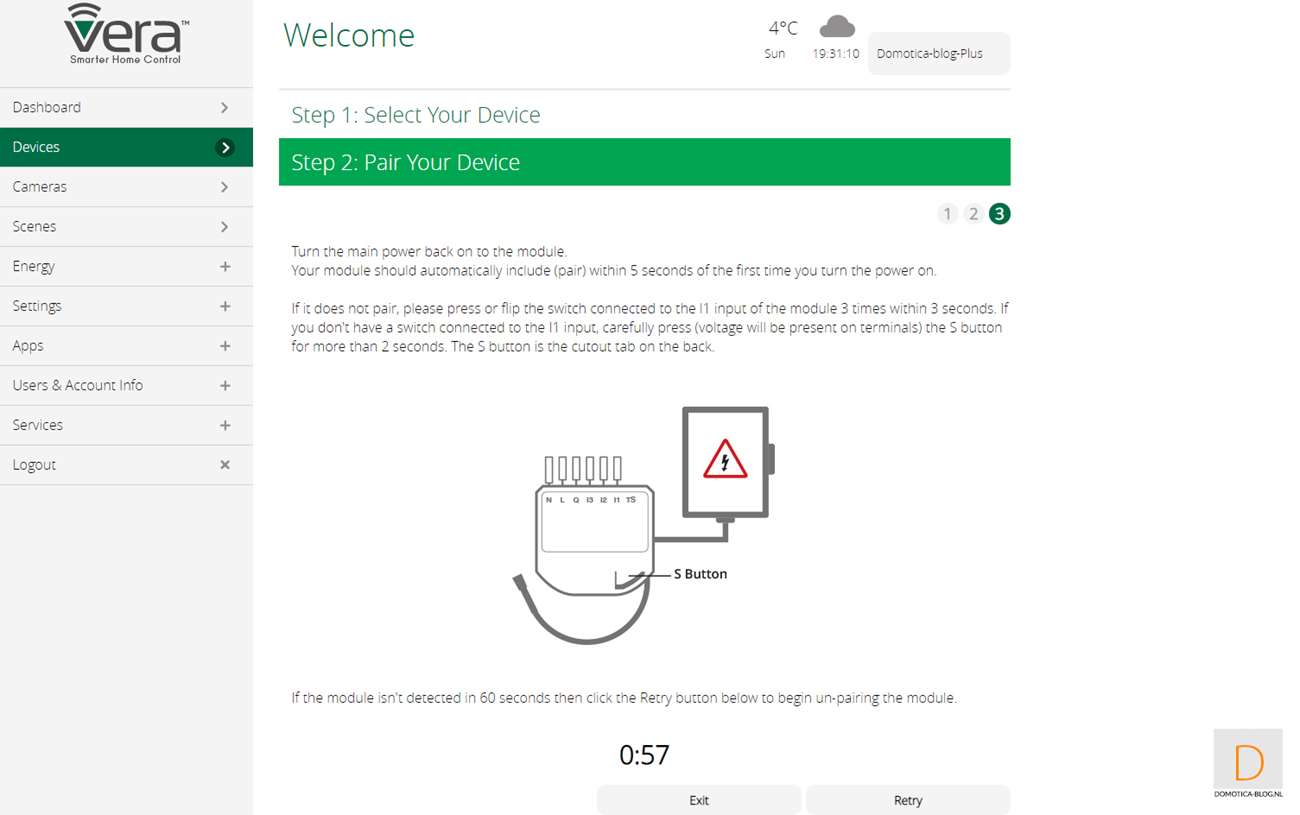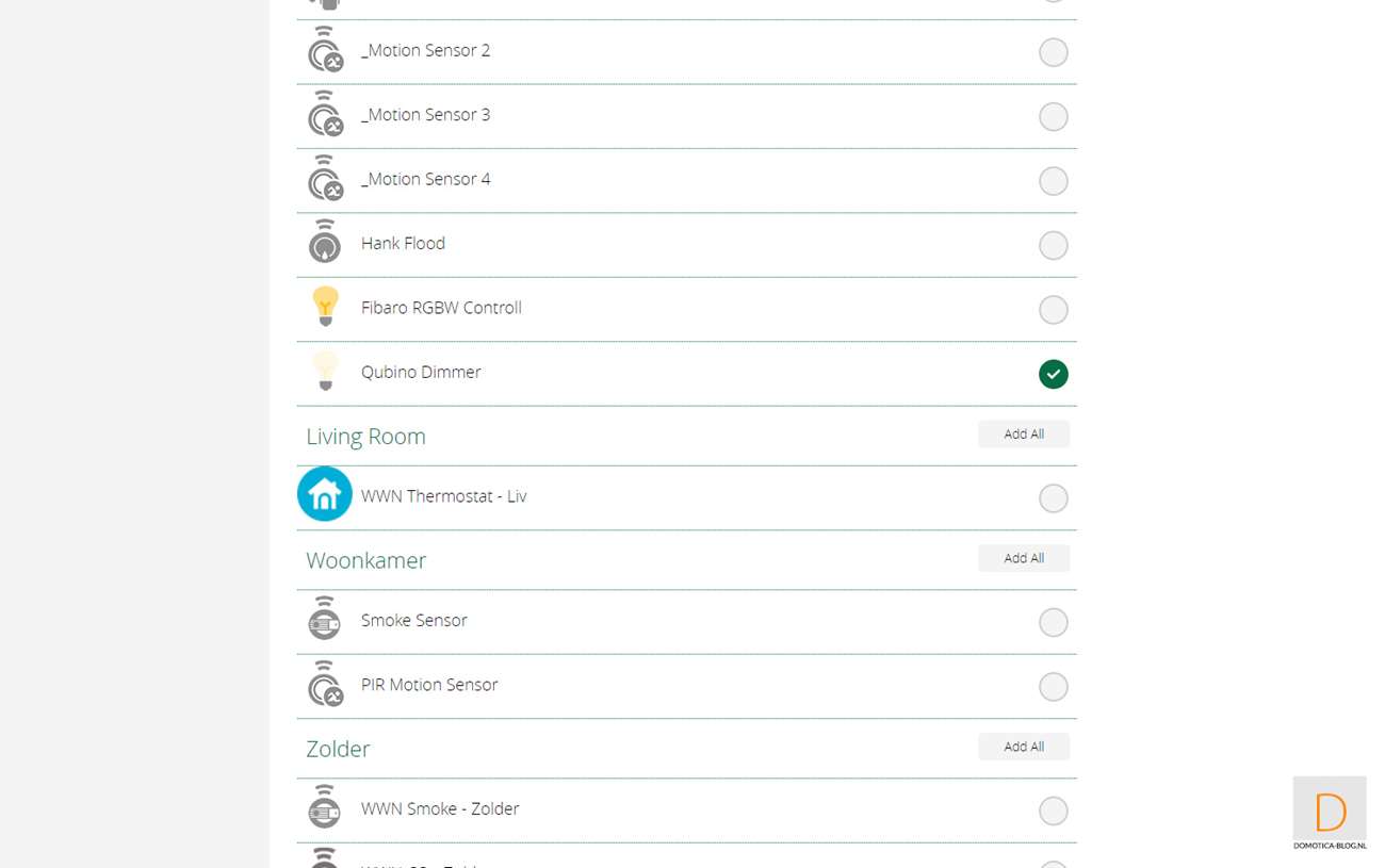 Deze Qubino heeft de mogelijkheid om 2 extra schakelaars aan te sluiten. Helaas is dit geen kwestie van plug'n play. Je zult eerst de module moeten toevoegen op de normale manier. Hierna moet je parameter 100 op 9 zetten. Hiermee geef je aan dat ipv de standaard bewegingsmelder een binaire schakelaar kan worden aangesloten. Verwijder hierna de module weer uit de Vera en voeg hem weer opnieuw toe. Nu zie je een extra schakelaar verschijnen op het dashboard maar helaas kan ik hem niet bedienen. Dit lijkt dus niet goed te werken.