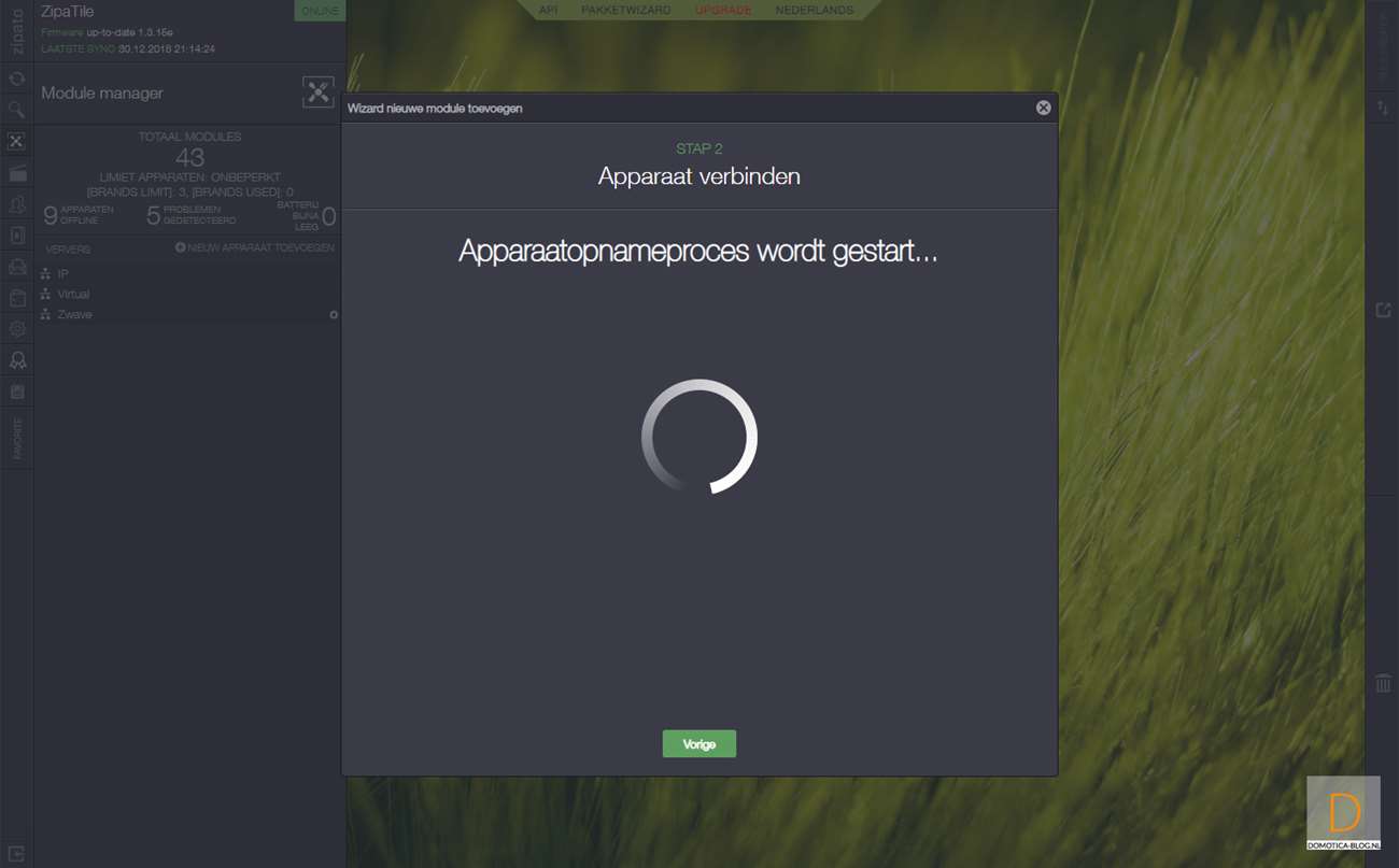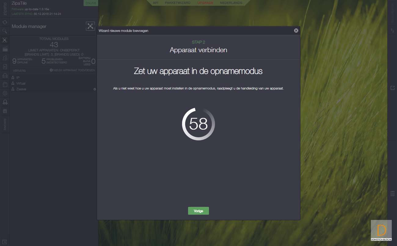 Het installeren kun je doen door de toevoegen procedure op te starten op je ZipaTile. Dit kun je doen door in te loggen op de ZipaTile en naar het apparaten gedeelte te gaan. Vervolgens klik je op "apparaat toevoegen" en hierna op Z-Wave. Als je de module van stroom voorziet zal hij gedurende 5 sec. automatisch herkend worden door de ZipaTile. Mocht dit niet het geval zijn dan kun je hem handmatig toevoegen door de "toevoegen" knop 3x achter elkaar in te drukken.