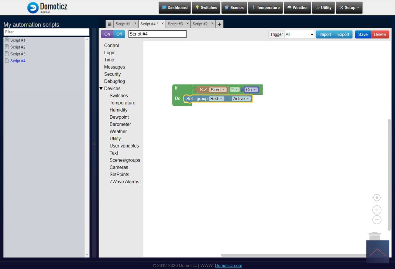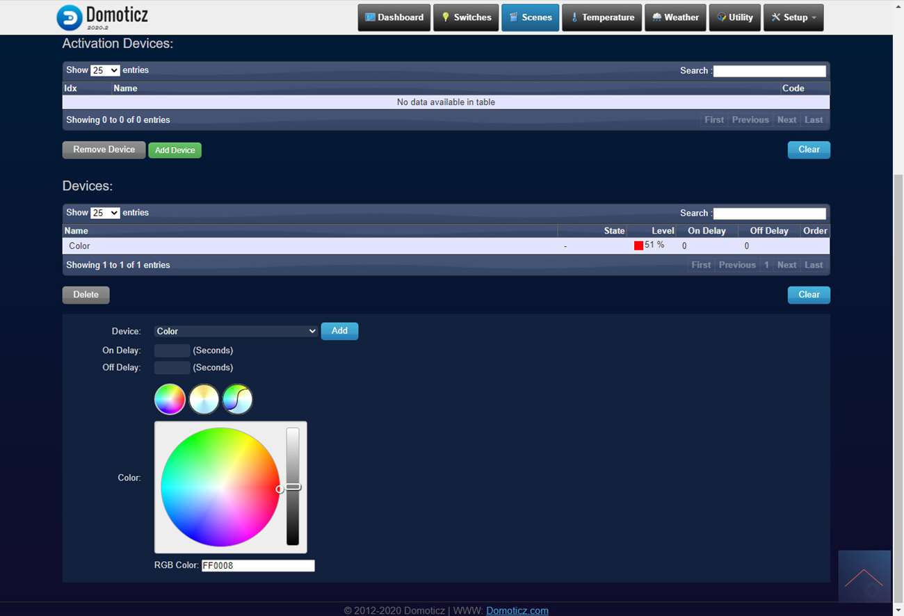 Je kunt natuurlijk verschillende soorten soorten zaken automatiseren. Zou kun je bv als je alarm afgaat de LED rood laten worden. We hebben geen alarm in Domoticz maar gebruiken even de sunset als voorbeeld. Dit kan natuurlijk elk soort trigger zijn.