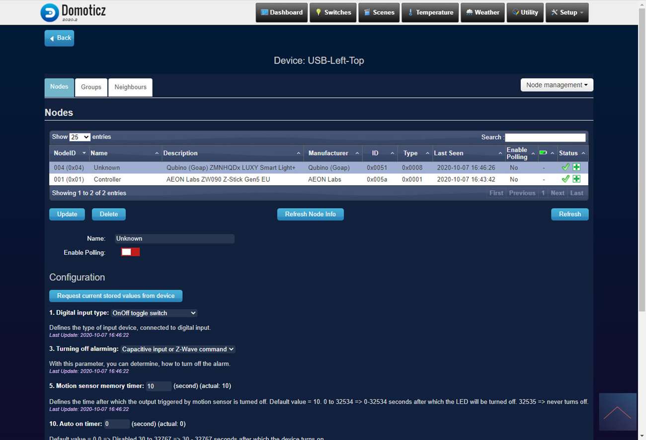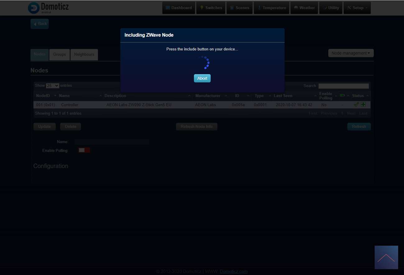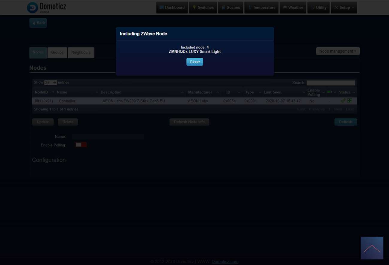 Als je alles dicht hebt gemaakt voorzie je de schakelaar weer van stroom en log in je op Domoticz. Je gaat vervolgens naar "setup", Hardware en klikt op de setup van de Aeotec Usb Stick/OpenZWave USB. Hierna druk je op "node management" en dan op "include node secure".