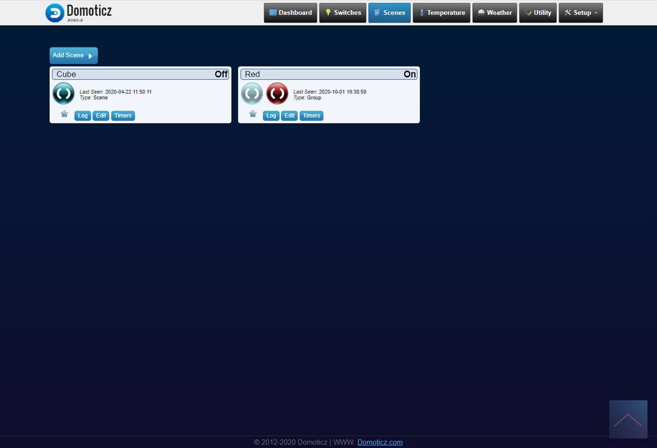 Omdat we vanuit blocky niet rechtstreeks een kleur kunnen zetten maak ik eerst een scene aan. Deze scene gebruik ik in blocky om de LED rood te maken.