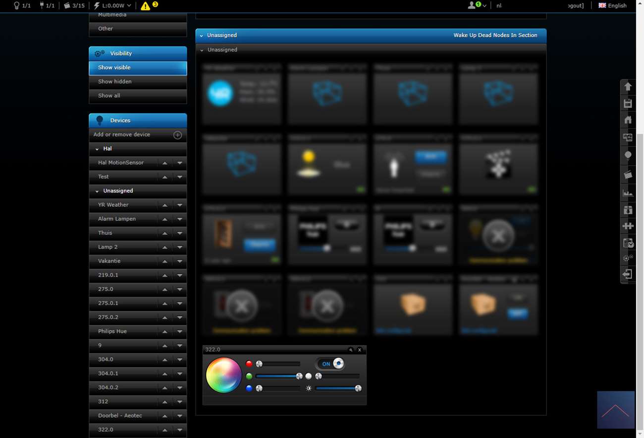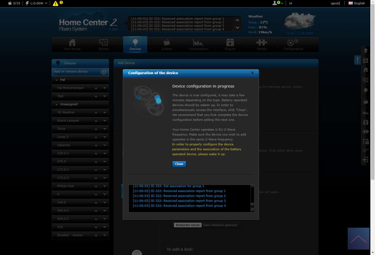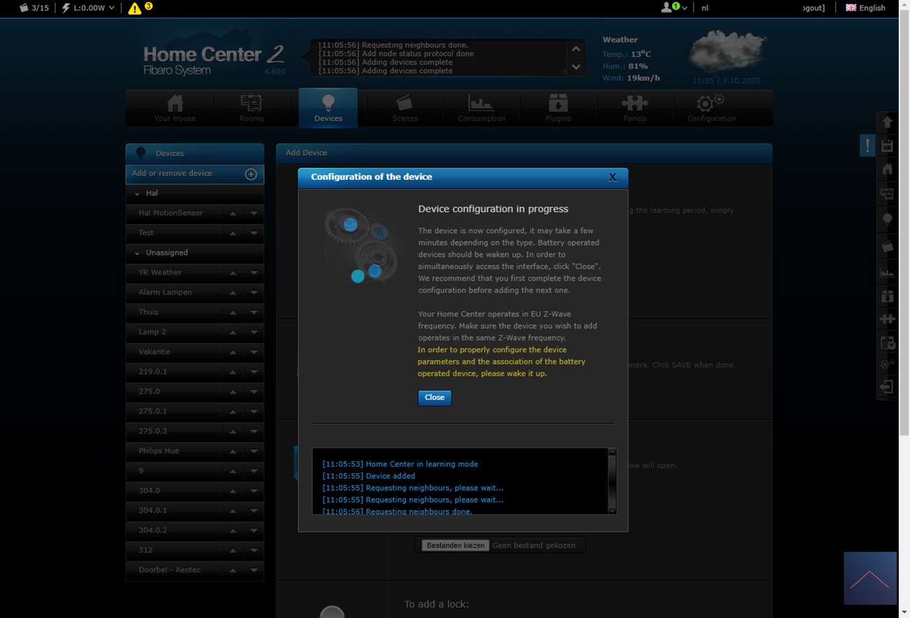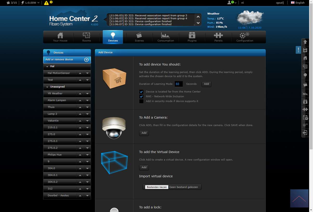 Als alles is aangesloten zet je de stroom erop en kan je het toevoegen starten. Om dit voor elkaar te krijgen log ik in op de HC2 en ga ik naar mijn apparaten.