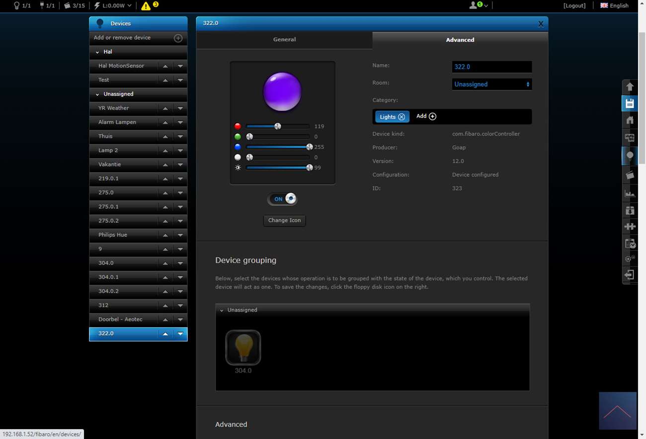 Als ik bij mijn apparaten kijk zie ik een RGBW controller en kan hem aan-/uitzetten. Ik mis helaas de mogelijkheid om de pieper/alarm te bedienen.
