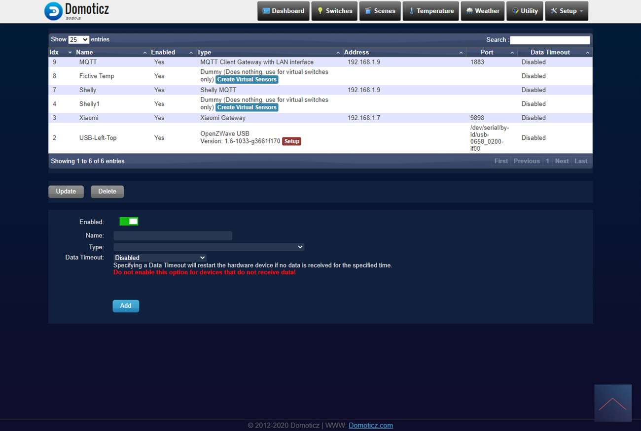De volgende stap is om in te loggen op de Domoticz en naar "Setup", "Hardware" en dan nog een keer setup bij de USB stick te gaan.