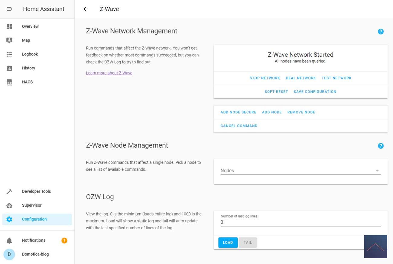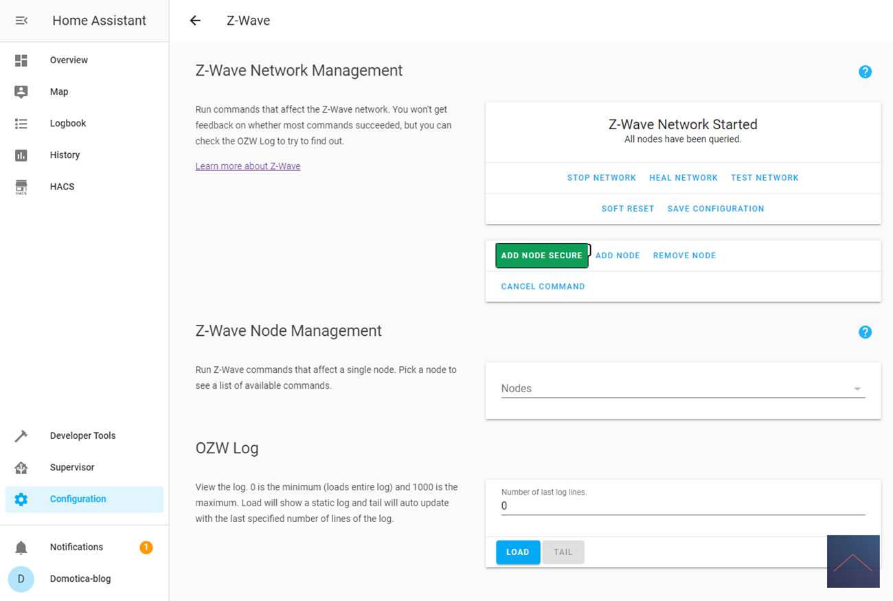 Nu we de installatie gedaan hebben loggen we in op Hass via je browser en ga naar je configuratie en hierna naar Z-Wave. Vervolgens klik je op "add node secure" om het toevoegen te starten.