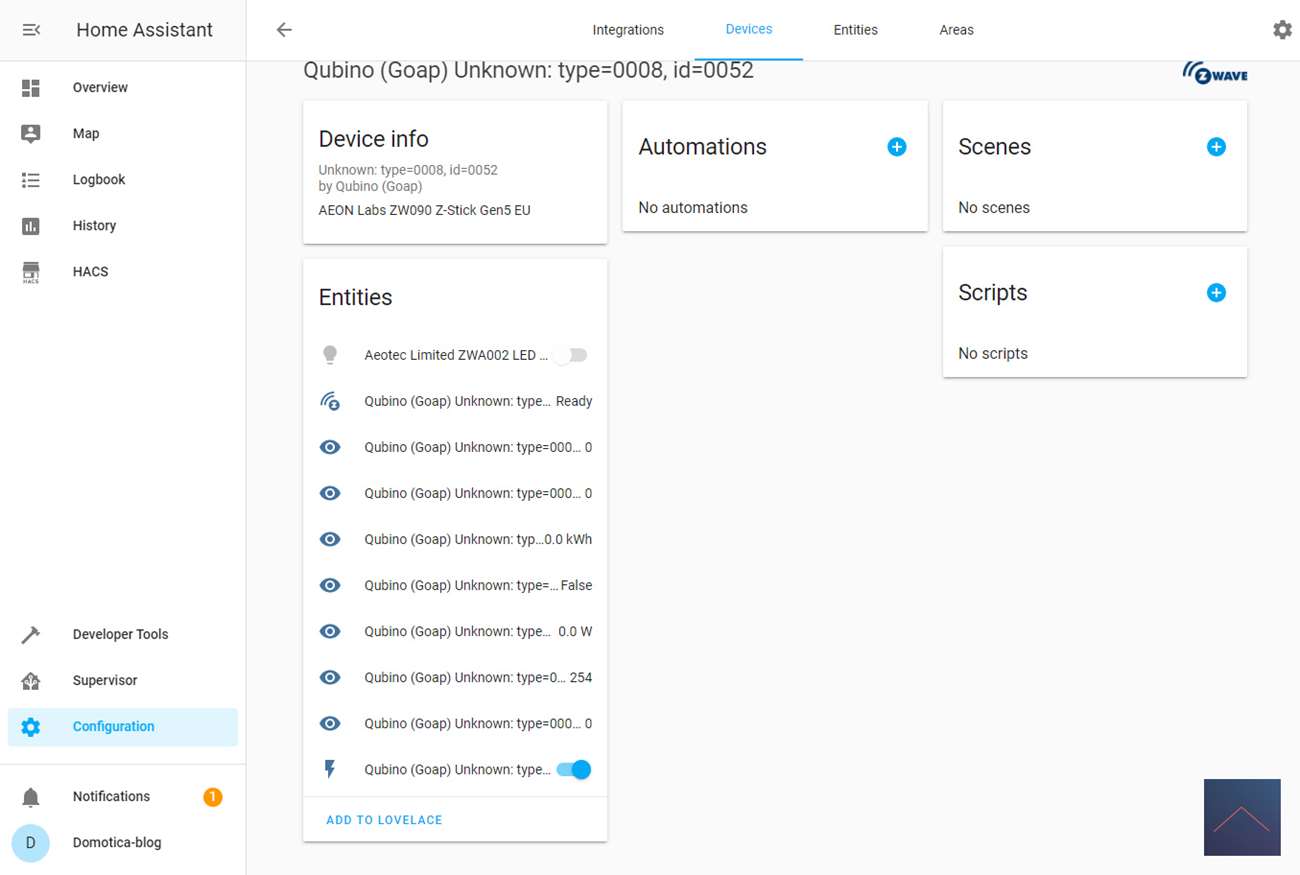 Helaas wordt de Luxy niet goed toegevoegd en kan ik hem niet bedienen. Ook dit probleem heb ik bij Qubino neergelegd. Ze geven aan dat HASS gebruikt maakt van Open Z-Wave versie 1.4 en dat de Luxy alleen goed werkt met de 1.6 versie. Er zijn uiteraard wel manieren (Z-Wave > MQTT) om dit naar 1.6 te krijgen maar eerlijk gezegd is de kans dat je hierdoor je andere Z-Wave apparaten niet meer werken nogal groot.