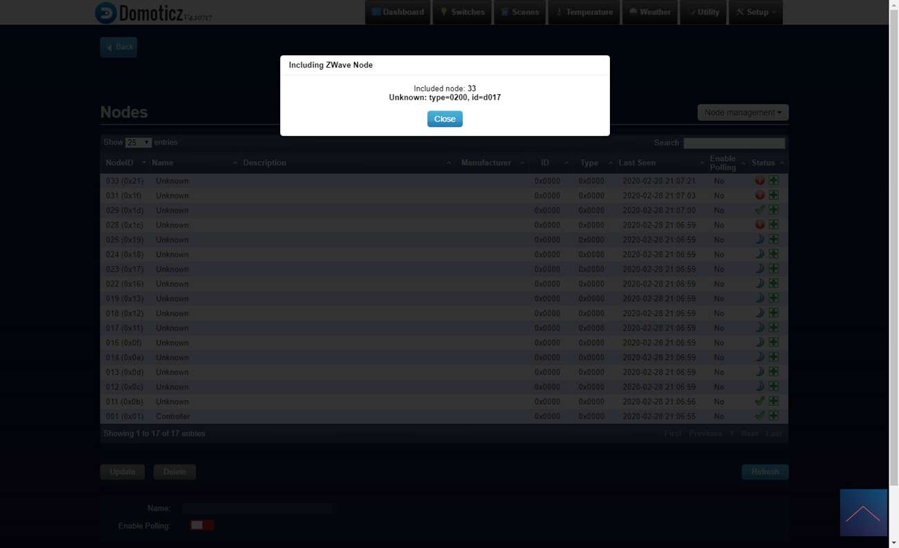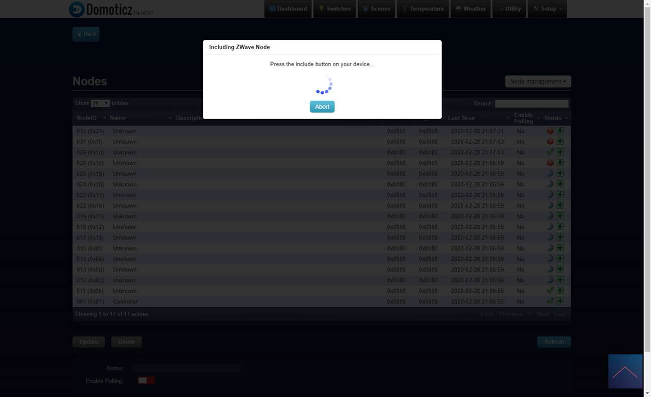 Log vervolgens in op Domoticz en ga naar het menu item "setup" en naar "hardware". Druk hierna op de setup bij de Aeon Labs controller en druk op include node secure. Er zal en een pop-up komen dat de controller in leerstand staat. Voorzie hierna de dimmer van stroom en druk 3x een kleine schroevendraaier in het reset gaatje. De LED zal rood gaan branden en hierna snel gaan knipperen om aan te geven dat het toevoegen is gelukt en dat de kalibratie is gestart.