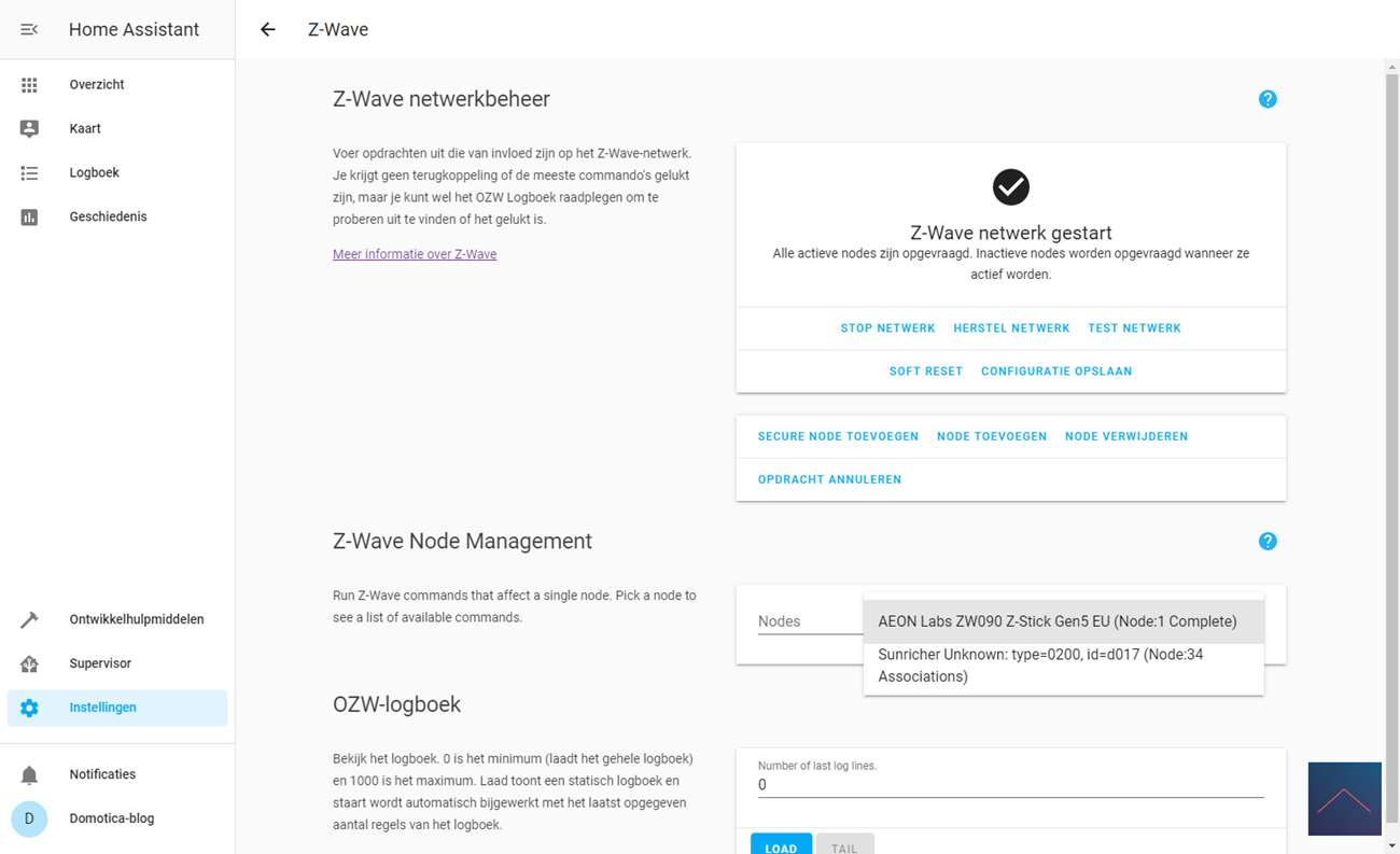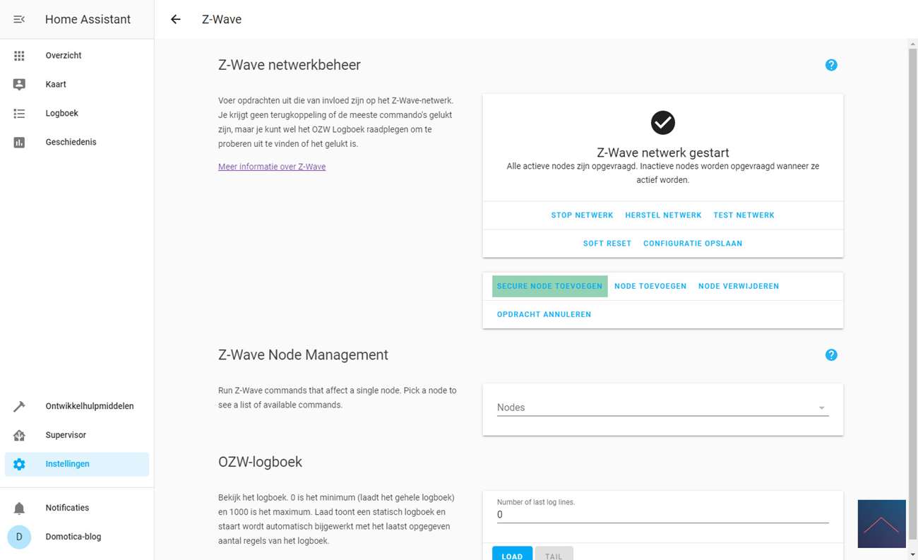 Log namelijk eerst in op Hass via je browser en ga naar je configuratie en hierna naar Z-Wave. Vervolgens klik je op "add node secure" om het toevoegen te starten. Voorzie hierna de dimmer van stroom. HASS geeft een zeer korte melding dat het toevoegen is gestart.