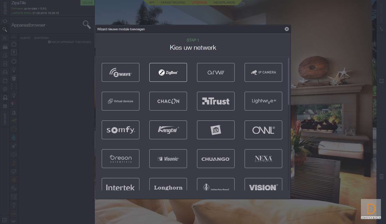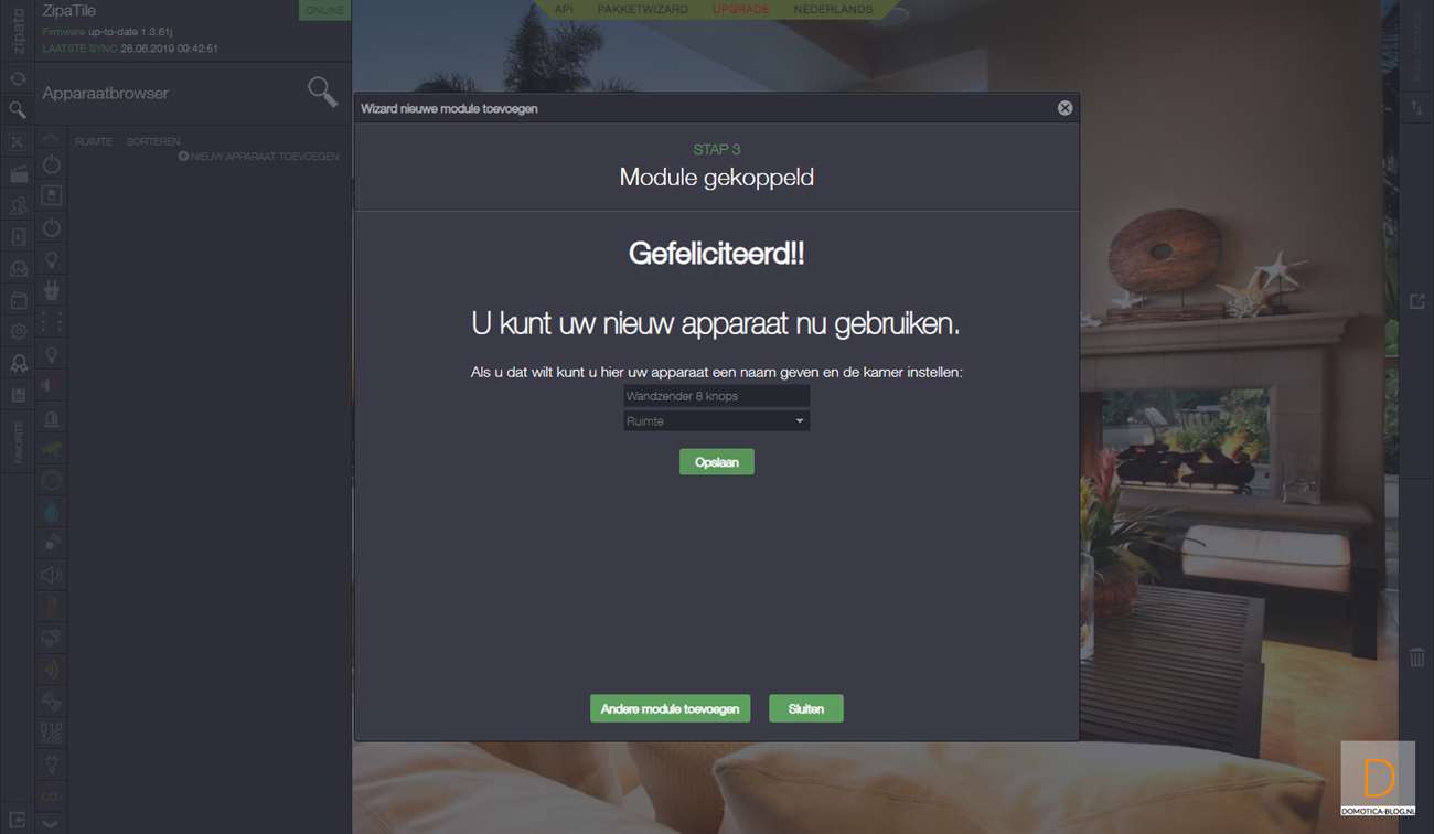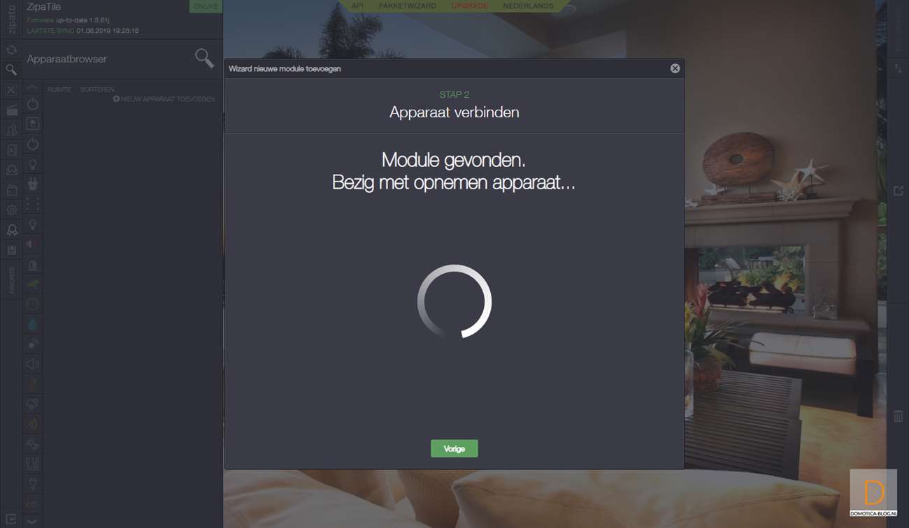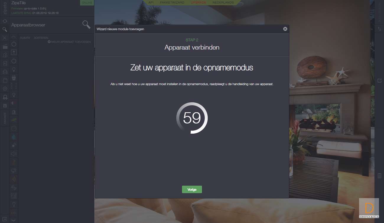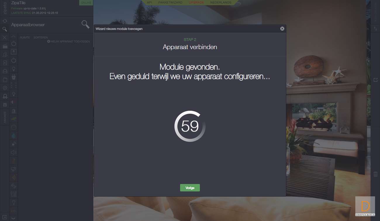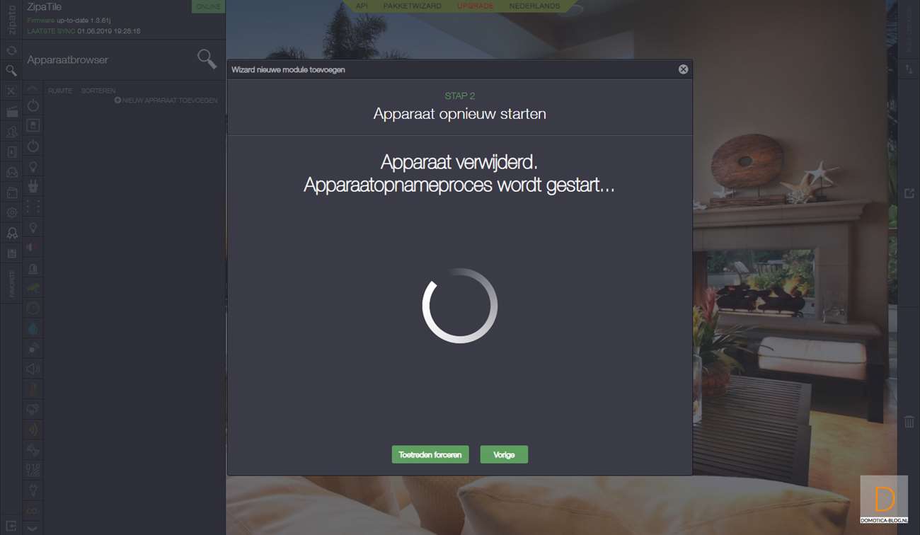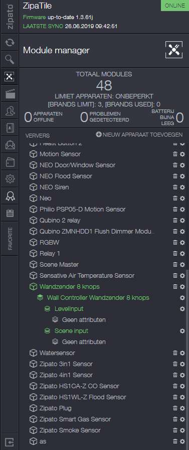 Als 2de controller voegen we hem toe aan de Zipatile. Als eerste log je in en ga je naar je apparaten en druk je op "nieuwe apparaat toevoegen" en vervolgens op Z-Wave. Hierna druk je 3 seconden beide knoppen (I)/(O) te gelijk in en het LEDje aan de voorkant zal oplichten. Als het toevoegen is gelukt zal de LED 6x gaan knipperen. Deze stap je herhaal je nogmaals om hem echt toe te voegen. Hij werd bij mij gevonden en toegevoegd en ik zie hem bij de configuratie tevoorschijn komen.