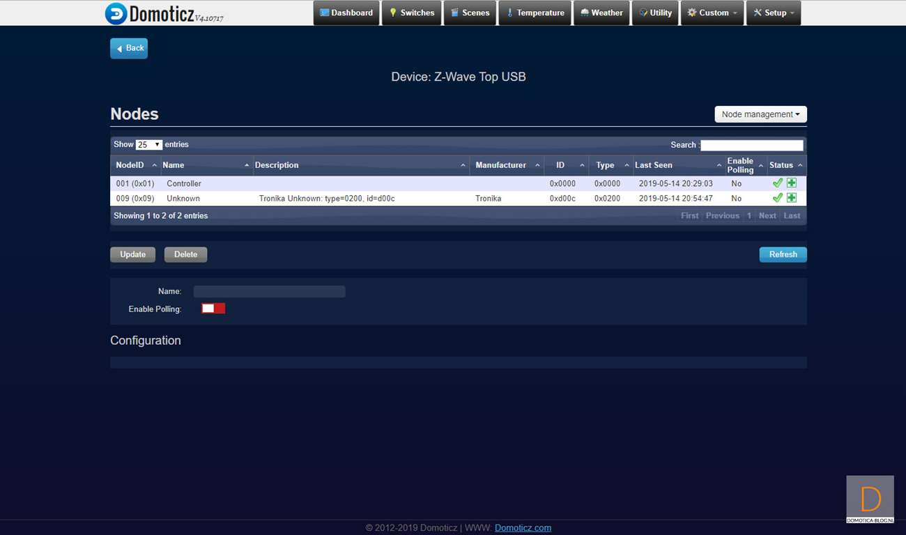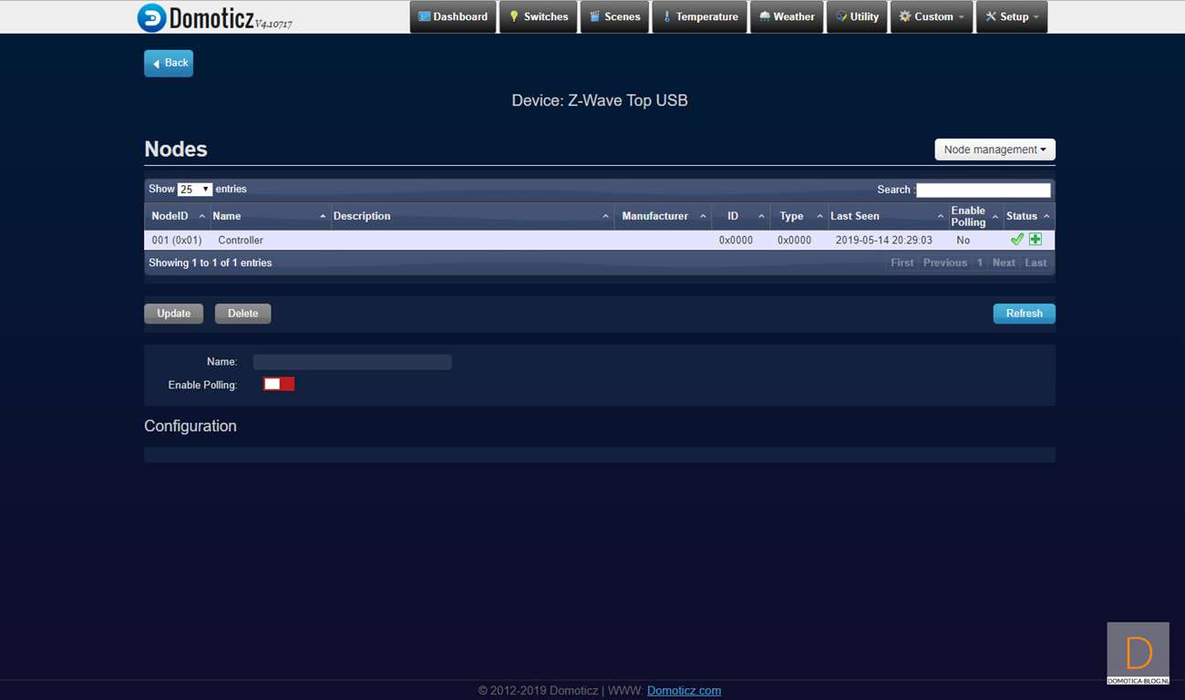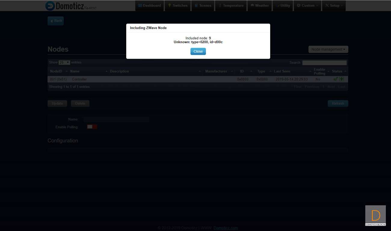 Je kunt het toevoegen starten door in te loggen en naar het menu item "setup" en hierna naar "hardware" te gaan. Vervolgens klik je op setup van de Aeon Labs controller en ga je naar include node secure (aan de rechterkant). Voorzie hierna de dimmer van stroom. Hij werd vrij wel direct gevonden en zie een aan- en uitschakelaar en ik kan het dimnivo bepalen. Tevens zie ik het totaal verbruik en huidige verbruik.