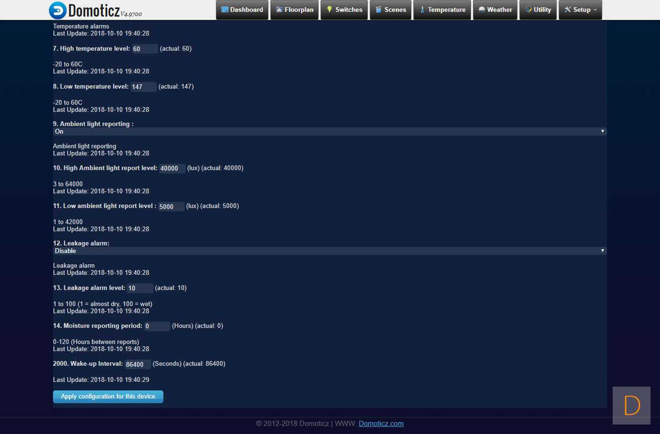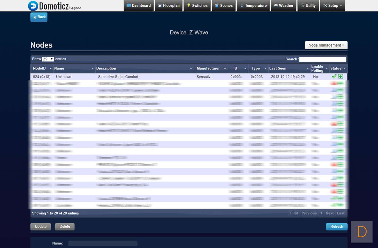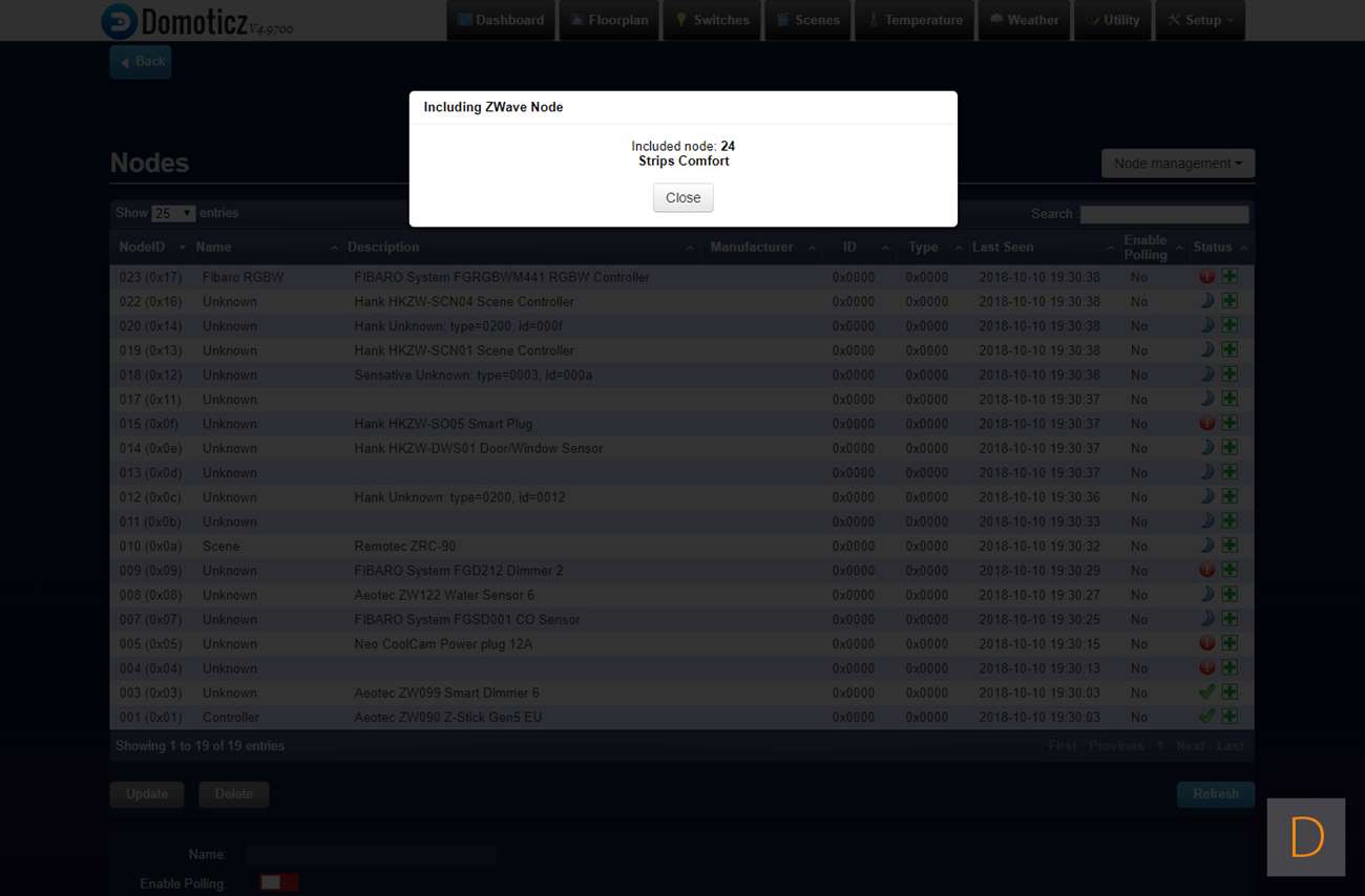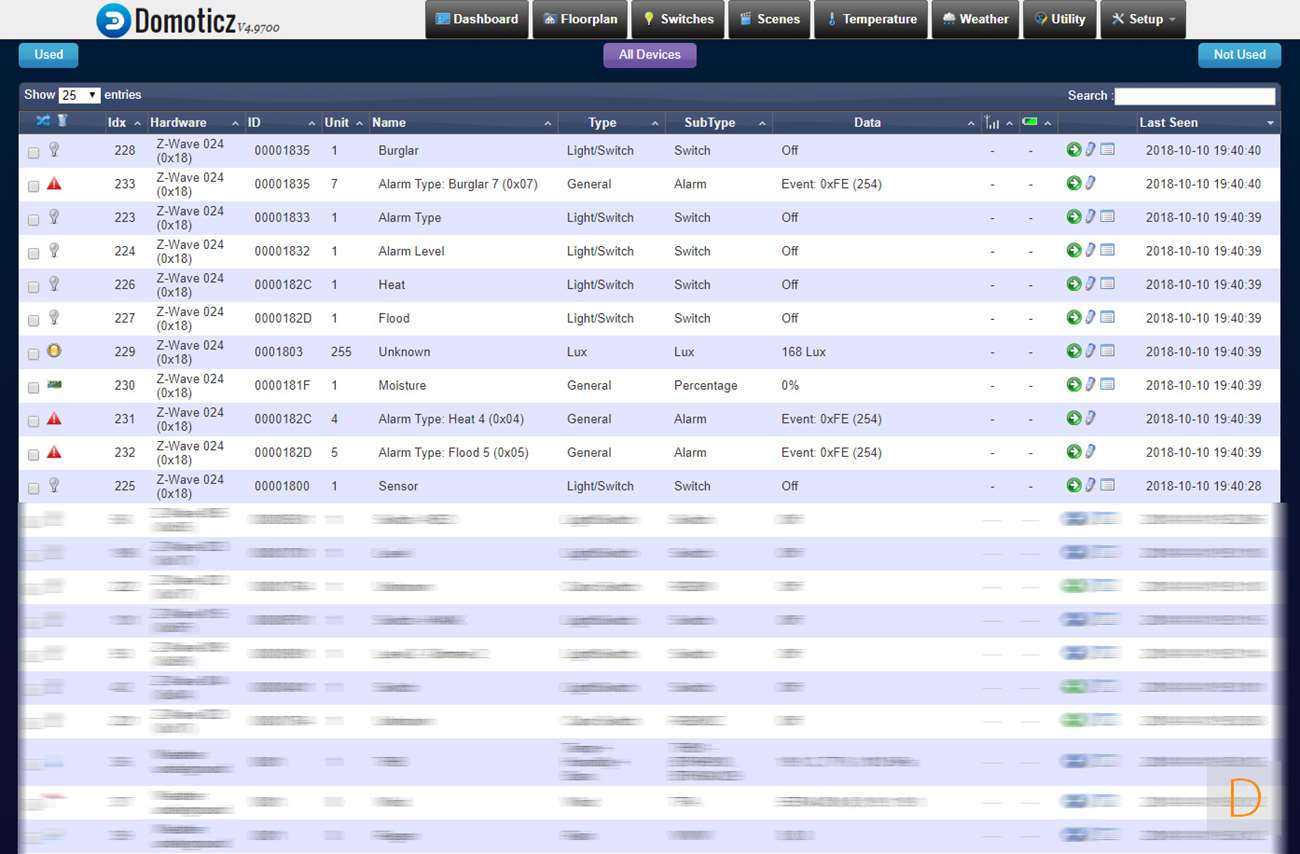Als laatste controller is Domoticz aan de beurt. Je kunt het toevoegen starten door naar het menu item "setup" en daarna naar "hardware" te gaan. Vervolgens klik je op setup van de Aeon Labs controller en ga je naar include node secure (aan de rechterkant). Na het verwijderen van de magneet op de achterkant van de sensor zal hij meteen gevonden worden. Mocht dit niet het geval zijn dan kun met het magneetje 3x over de sensor heen bewegen. Hierbij zal het LED gaan oplichten als dit 5x achter elkaar gebeurd dan is het toevoegen niet gelukt. Hij werd bij mij gelukkig gevonden en zie hem bij mijn apparaten verschijnen (LUX, temperatuur, water alarm, batterijniveau).