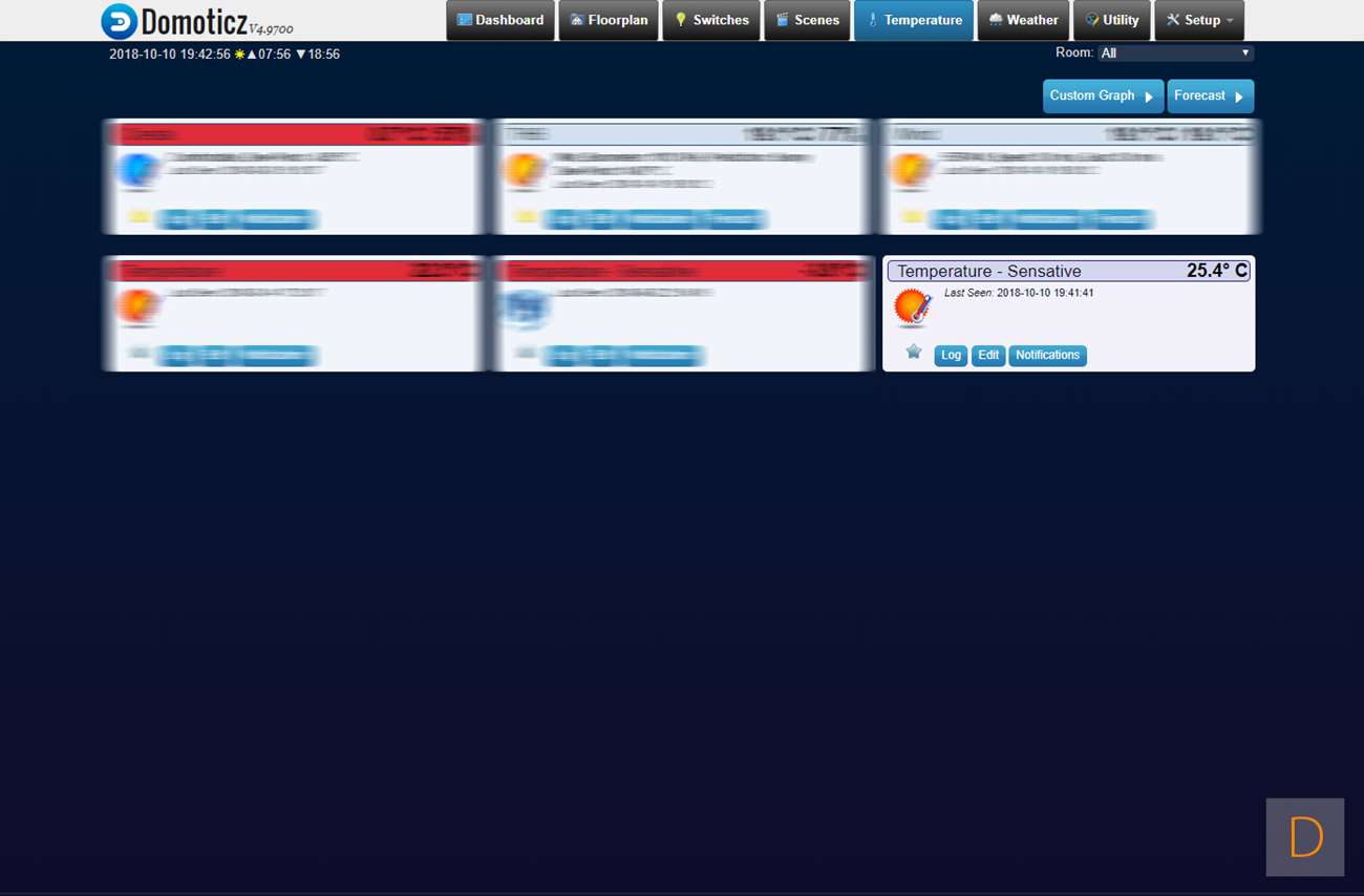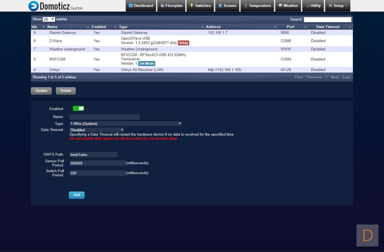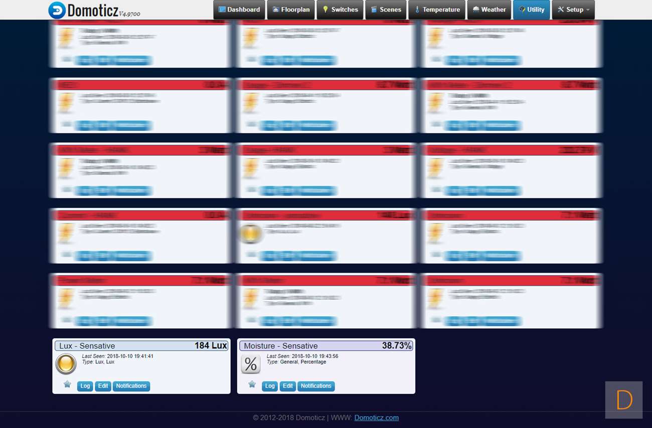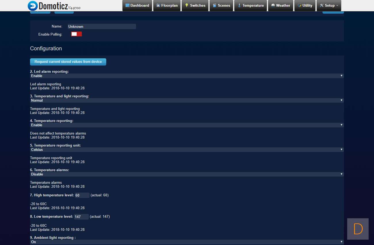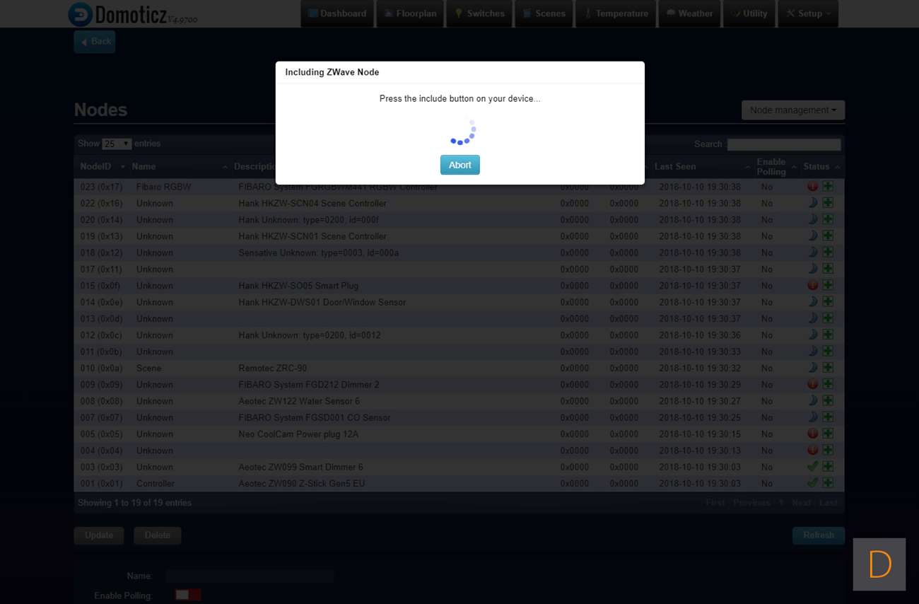 Als laatste controller is Domoticz aan de beurt. Je kunt het toevoegen starten door naar het menu item "setup" en daarna naar "hardware" te gaan. Vervolgens klik je op setup van de Aeon Labs controller en ga je naar include node secure (aan de rechterkant). Na het verwijderen van de magneet op de achterkant van de sensor zal hij meteen gevonden worden. Mocht dit niet het geval zijn dan kun met het magneetje 3x over de sensor heen bewegen. Hierbij zal het LED gaan oplichten als dit 5x achter elkaar gebeurd dan is het toevoegen niet gelukt. Hij werd bij mij gelukkig gevonden en zie hem bij mijn apparaten verschijnen (LUX, temperatuur, water alarm, batterijniveau).